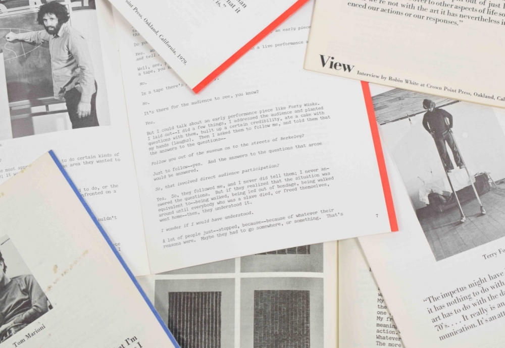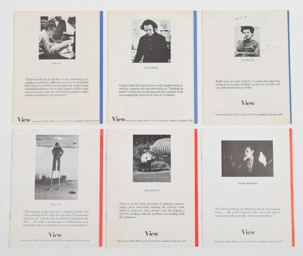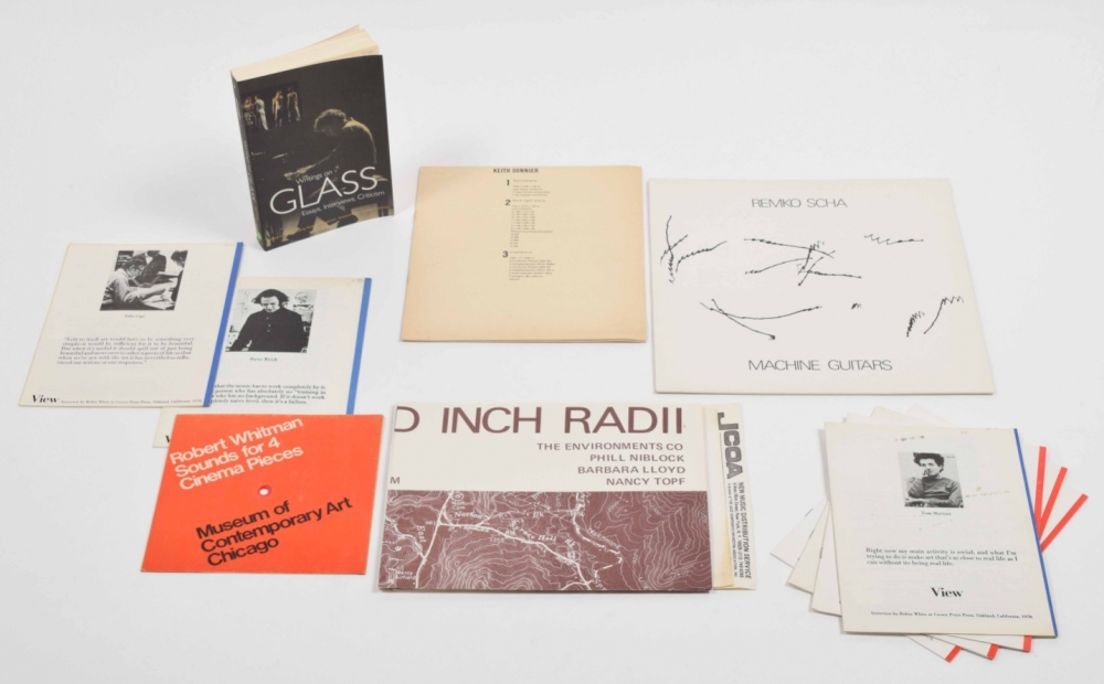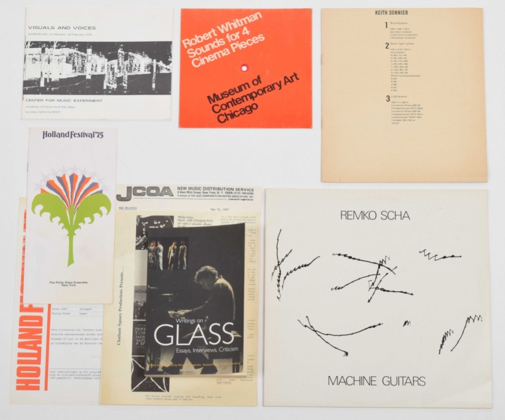 + View. Six booklets featuring interviews by Robin White at Crown Point Press, Oakland California. 1978-1979. Includes: John Cage, Steve Reich, Tom Marioni, Laurie Anderson, Howard Fried, Terry Fox. 23 x 18 cm, 16 - 24 pp. each. + Keith Sonnier, 1. Soundpiece. 2. Dark light piece. 3. Lightpiece. Eindhoven, Van Abbemuseum, 1970. Exhibition catalogue, 12 pp. + Phill Niblock, poster 56 x 43 cm and press material on: Ten Hundred Inch Radii, Environments IV, nonverbal theater with dance music film, produced by the Experimental Intermedia Foundation, New York 1973. + The Philip Glass Ensemble, Holland Festival 1975 brochure (text in English and Dutch). + LP by Remko Scha, Machine Guitars. Eindhoven, Kremlin Products, 1982. Presents recordings at the Apollohuis in Eindhoven and Mark Abbott at the WKCR studio in New York. Cover art by Scha. Good copy. + 2 more. (total 11)