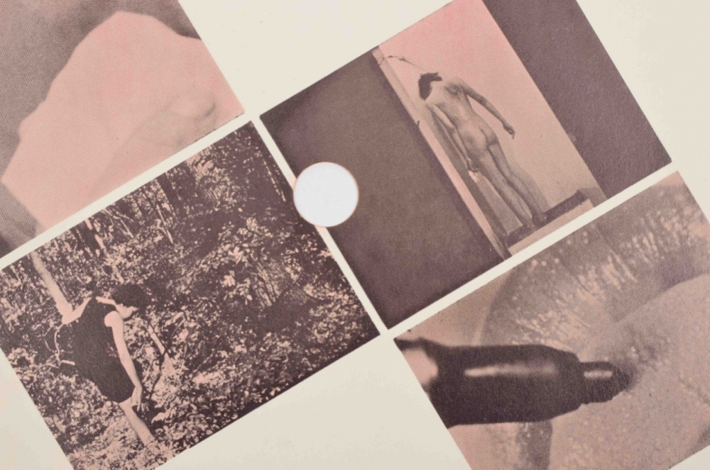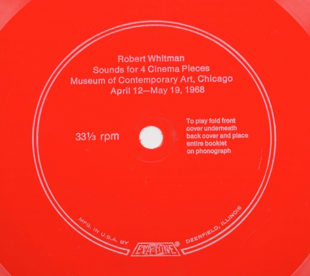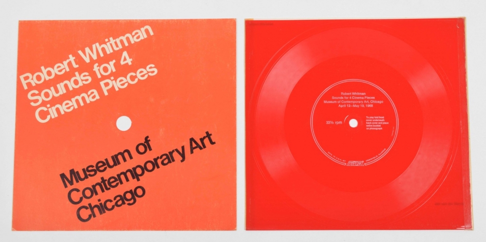 Robert Whitman, Sounds for 4 cinema pieces. Chicago, Museum of Contemporary Art, 1968. Exhibition catalogue containing a red flexi-disk inserted between two sheets, with text and images on four films. 18.5 x 19 cm. 11 min. 33 rpm soundtrack. Some toning on cover, else fine.