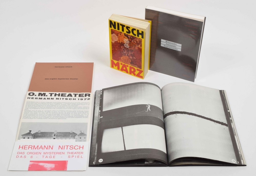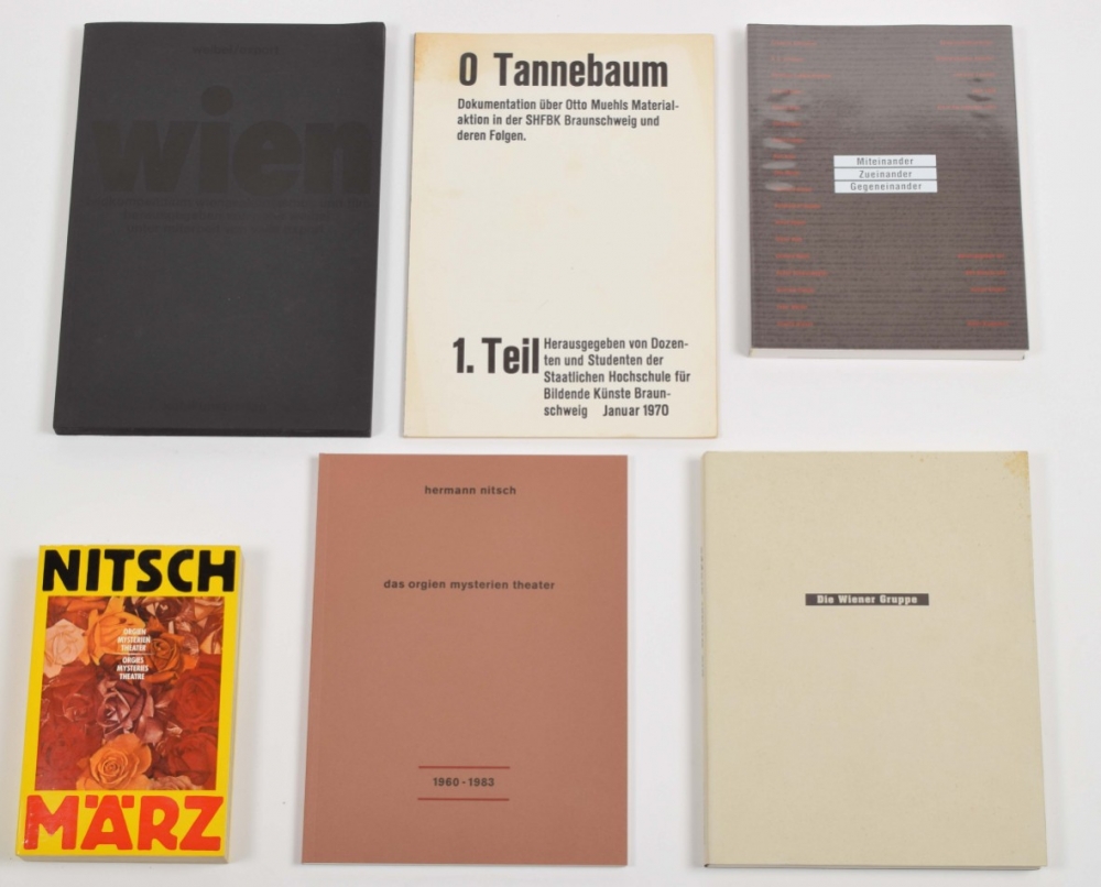 + Herman Nitsch, O.M. theater. Romenthal, Self-published, 1972. + O Tannebaum. Dokumentation uber Otto Muehls Materialaktion in der SHFBK Braunschweig und deren Folgen. 1. Teil. Braunschweig, 1970. + Herman Nitsch, Das Orgien Mysterien Theater 1960-1983. Eindhoven, Van Abbemuseum, 1983. + Otto Breicha and Hubert Klocker, Miteinander, Zueinander, Gegeneinander. Klagenfurt, Ritter Verlag, 1992. + Ephemera: announcements of the Wiener Gruppe/ Nitsch at Galerie A, Galerie Hundertmark Cologne and others. (total 6)