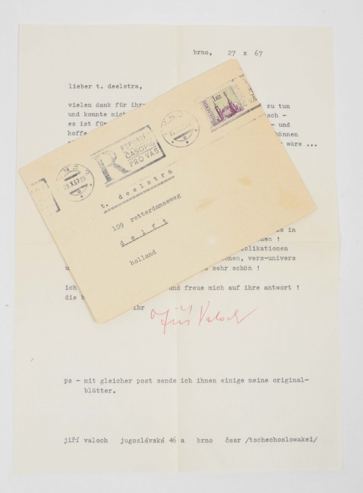 + Untitled, 1965-7. 29 x 21 cm. Slight browning along top right corner and left edge, else fine. + Untitled, 1967. 29 x 21 cm. Browning especially along top and right side. + Panna-vierge, hlas=voix, 1964/5. 30 x 21 cm. Signed in red pen 27 10 67. Creasing and browning mostly on bottom part, small tear 1 cm in centre bottom. + Flyer on thick white sheet printed both sides. Contains information on Valoch's works 1964-67. Signed in red pen dated 27 10 1967. All in original brown envelope. + Letter 27 10 1967 from Valoch to Deelstra. (total 7)