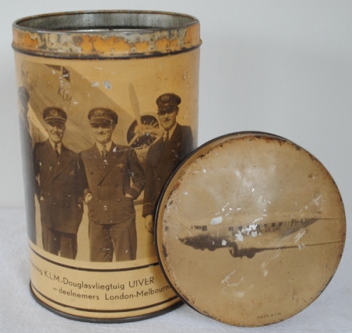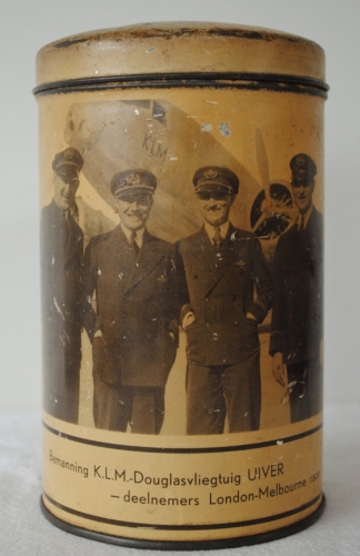 See the Dutch description: Beschuitblik, Bemanning K.L.M.-Douglasvliegtuig Uiver - deelnemers London-Melbourne race, 1934. Met een foto van de bemanning en het vliegtuig en een kaart van de route. 1934.