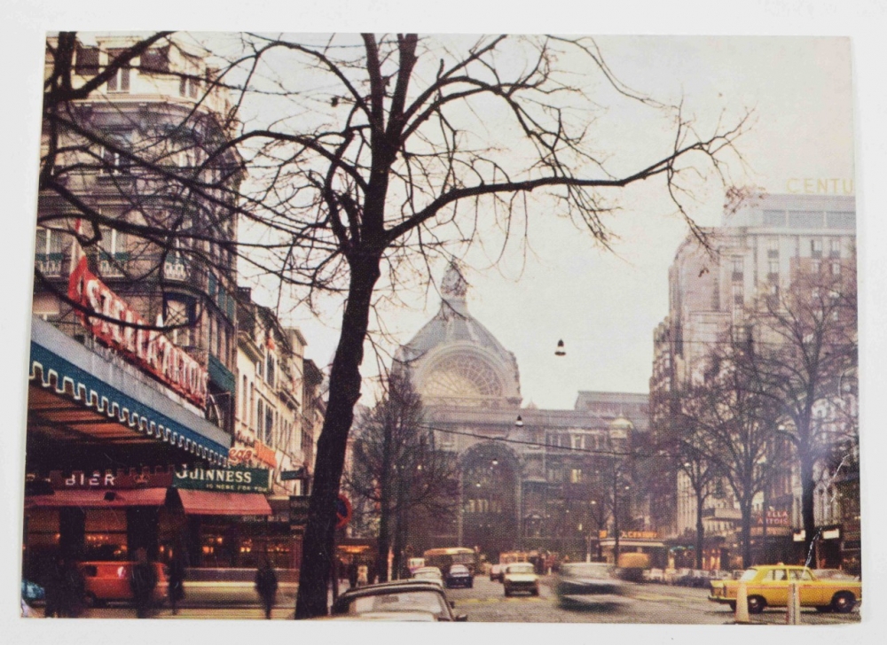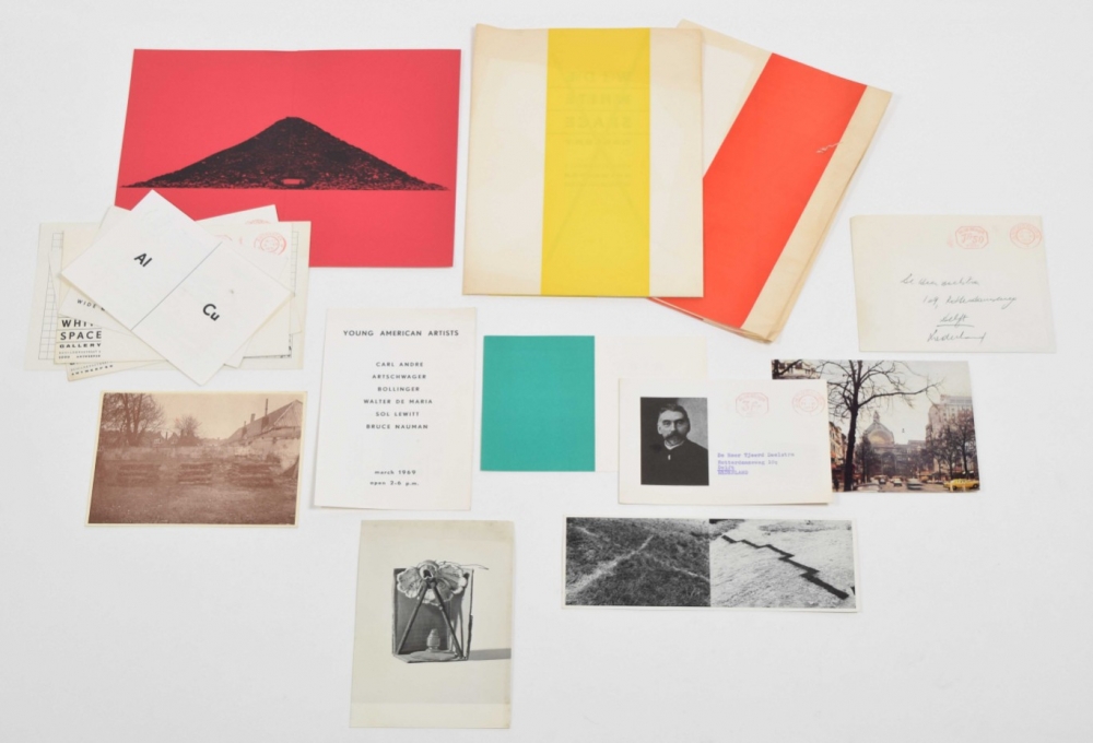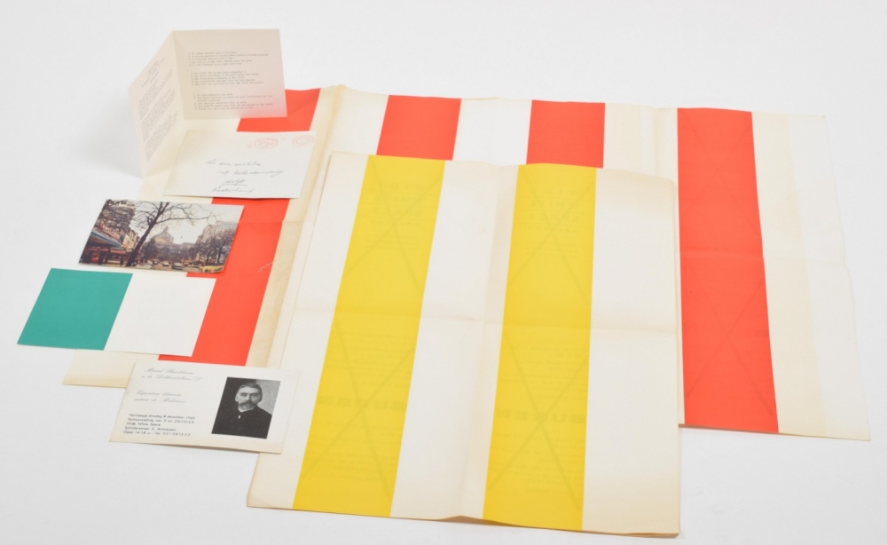 + Poster in white/yellow variation announcing the 1972 show with 1971 details crossed out. Offset litho, each 77 x 52 cm folded in 8 parts. Age wear, browning along folds and creasing. The red/white poster has a tear of 2.5 cm. Rare items. + 14 cards announcing shows by Broodthaers, Lawrence Weiner (1969), David Lamelas, Carl André (1970), Edward Kienholz (1971), Panamarenko, Richard Long, Ruthenbeck and others. (total 17)
