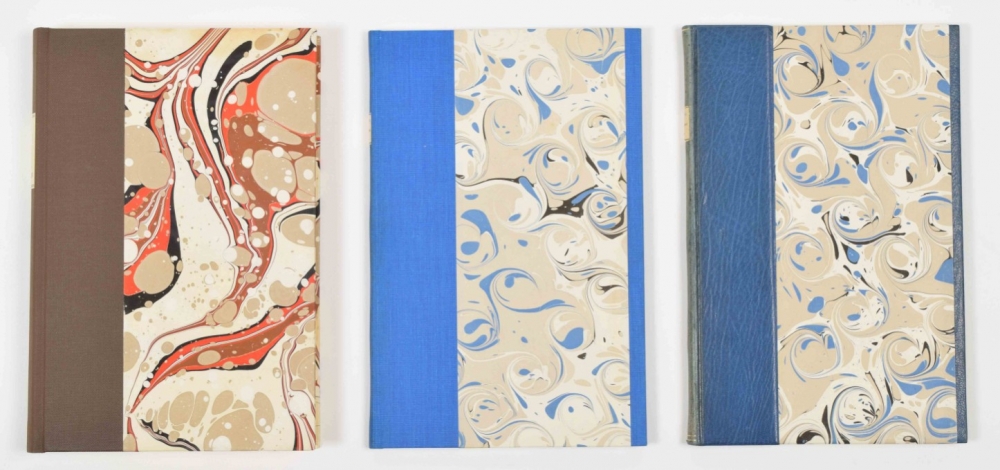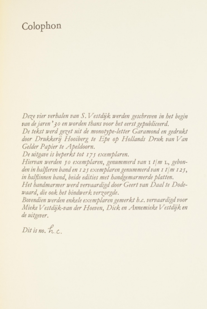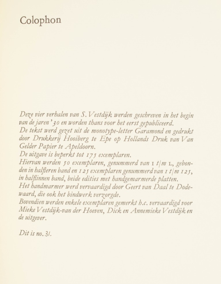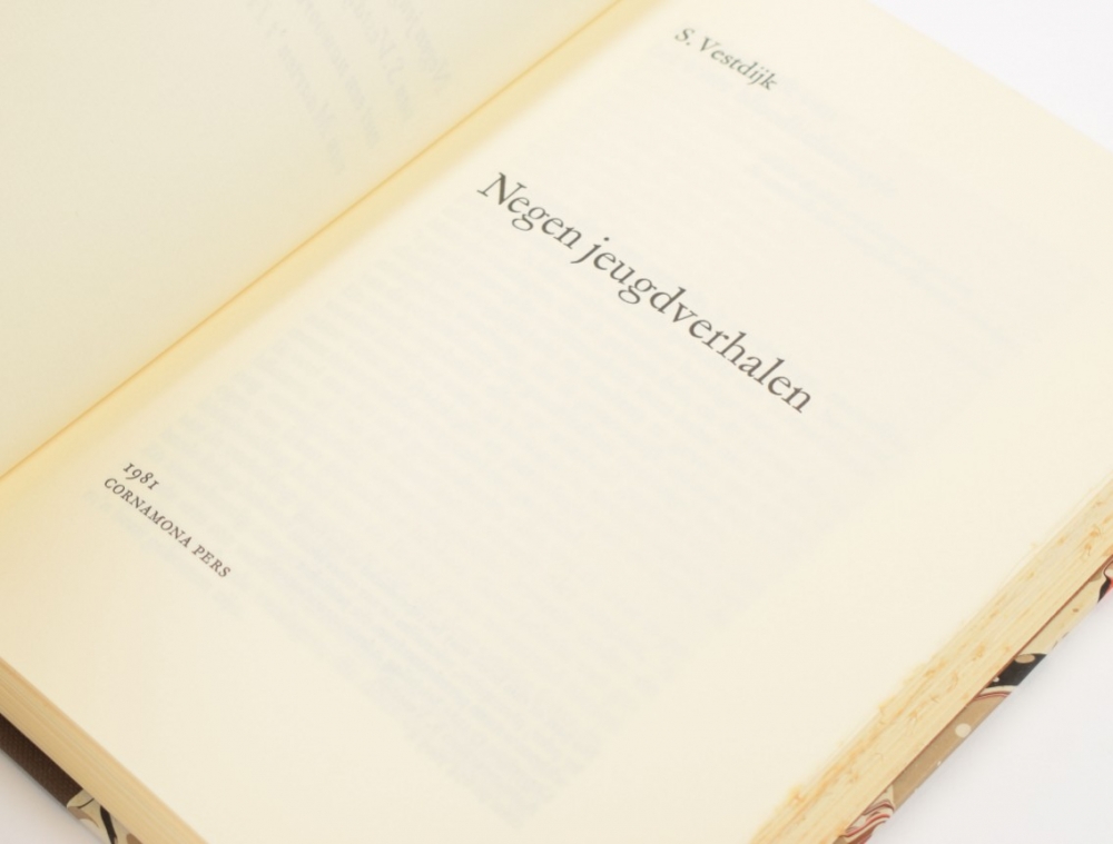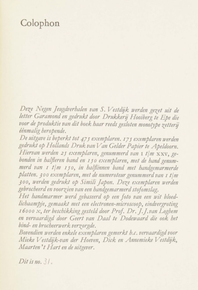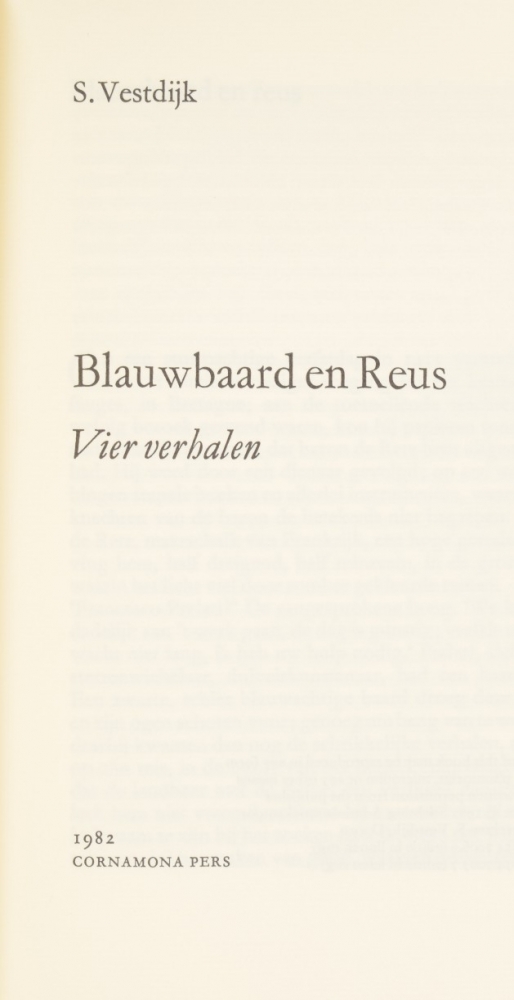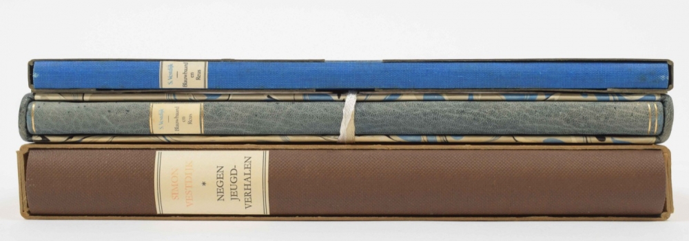 Negen jeugdverhalen. Postscript Maarten 't Hart. Cornamona Pers, 1981, 204,(3) p. No. 31 of 475 copies, clothbacked with orig. marbled boards in slipcase + Blauwbaard en Reus. Vier verhalen. Cornamona Pers, 1982. 57,(3) p. Clothbacked with orig. marbled boards in slipcase. No. 31/175 - and [idem], copy in half-calf with orig. marbled boards. A few copies were marked h.c., exclusively for family and the publisher. This is the copy that was made for the publisher, Dolf Hamming.