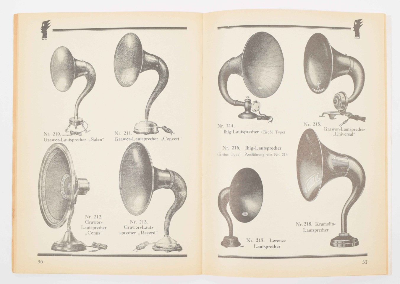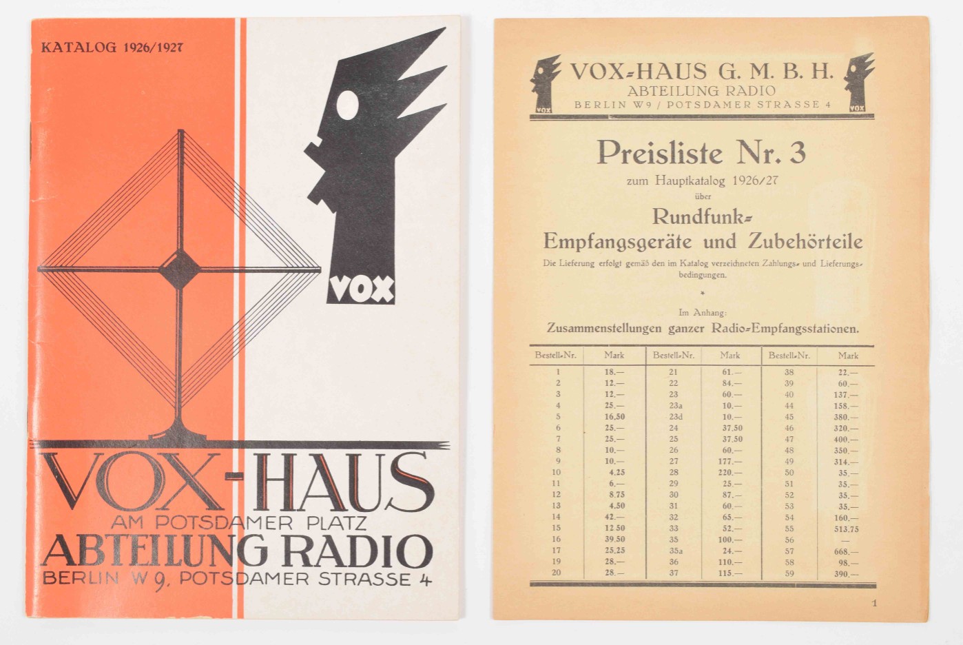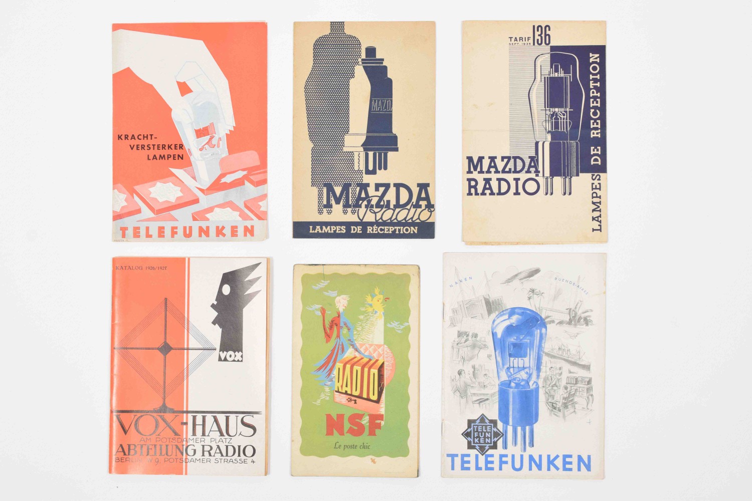 Vox-Haus am Potsdamer Platz. Katalog 1926/1927. Abteilung Radio. Berlin. With inserted price list + 2 French brochures for Mazda Radio, 1935 and 1937 + 2 Dutch brochures for Telefunken - and 1 brochure for NSF Radio with price list.
