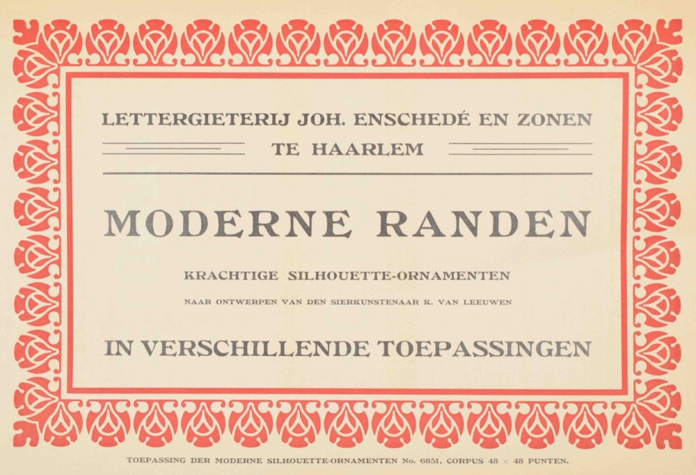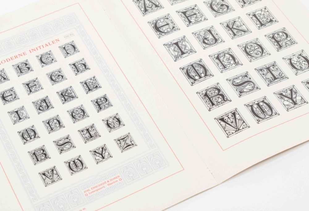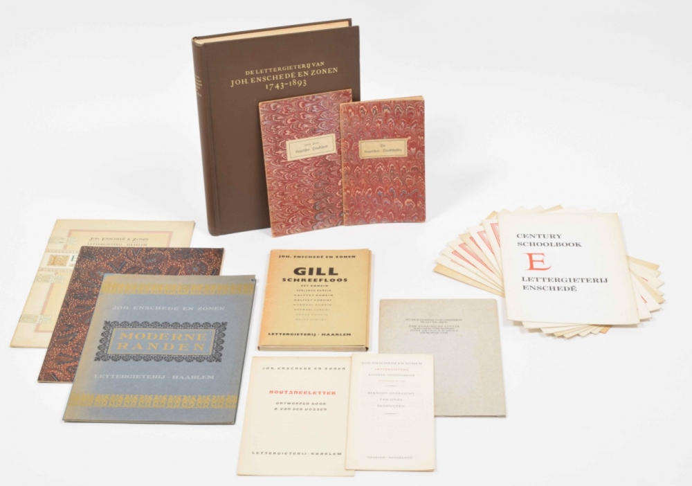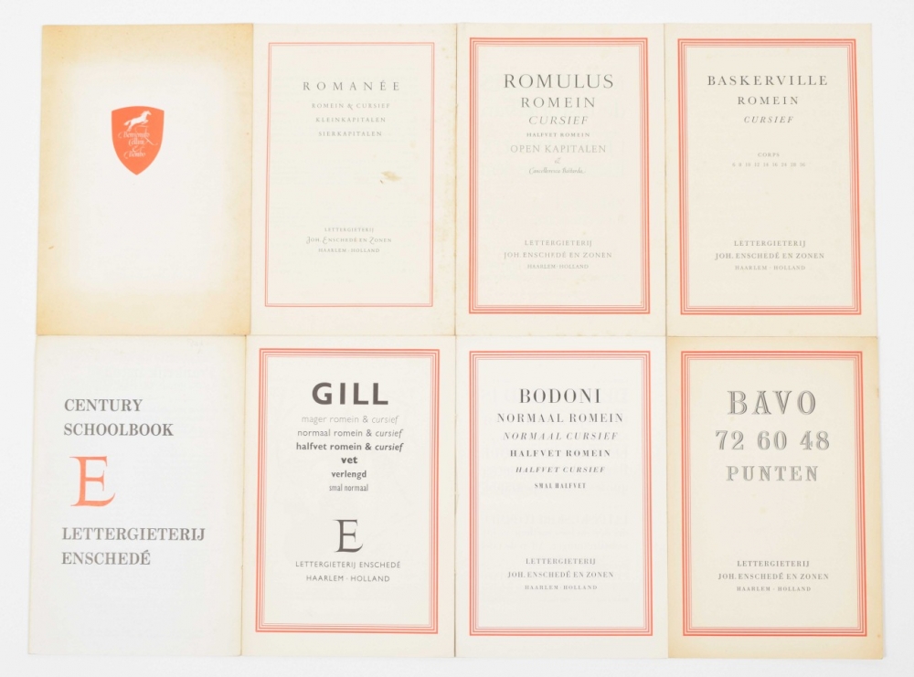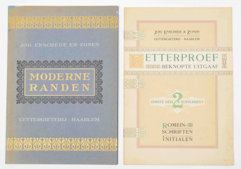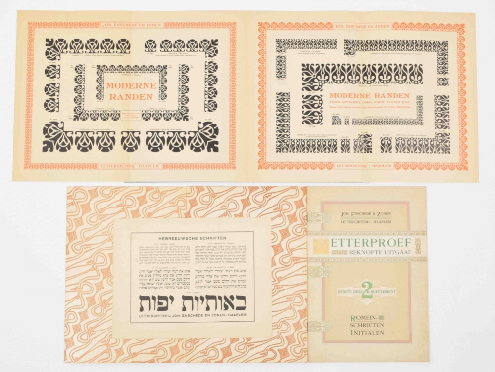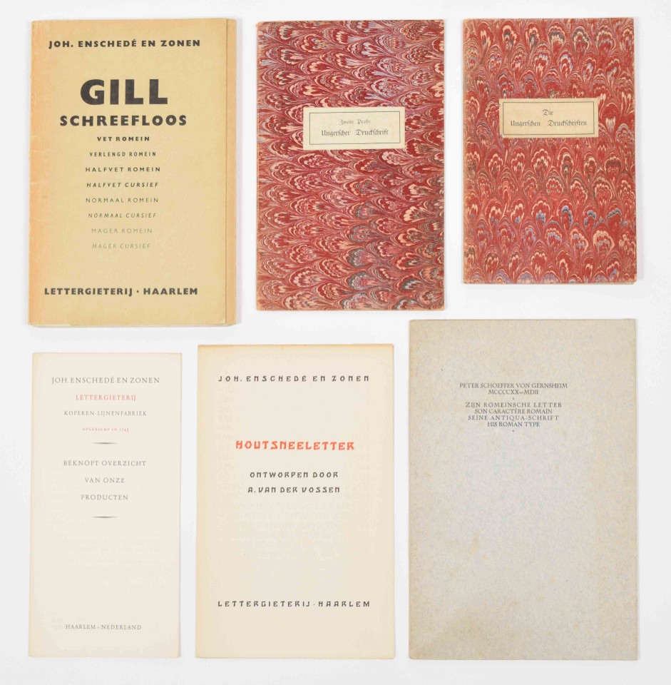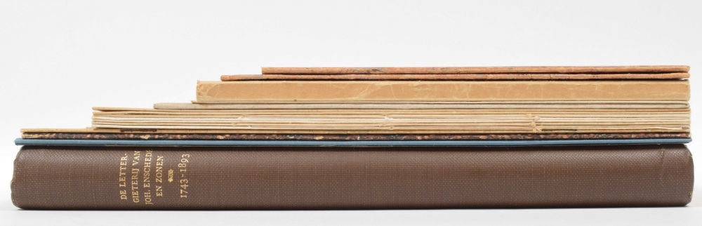en zonen, 1912 + idem, Moderne randen. Rebacked with cloth strip, sm. chip to front cover, sl. discoloured + idem, Letterproef. Beknopte uitgaaf. Eerste deel 2e supplement. Romein-schriften. Initialen + De lettergieterij van Joh. Enschedé en zonen. Gedenkschrift 1743-1893. Modern cloth - and 14 more.