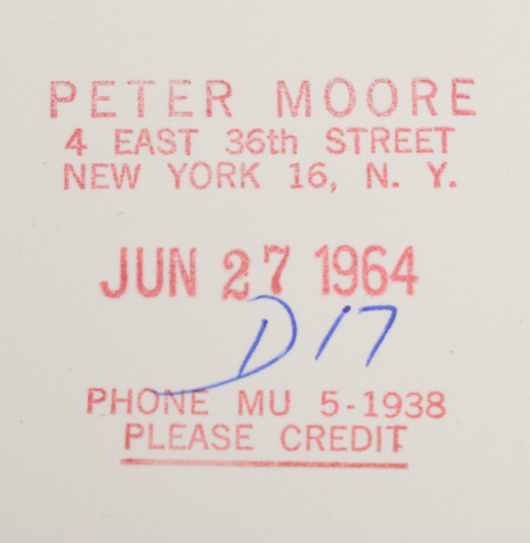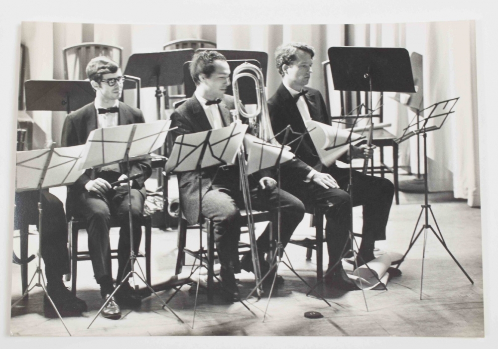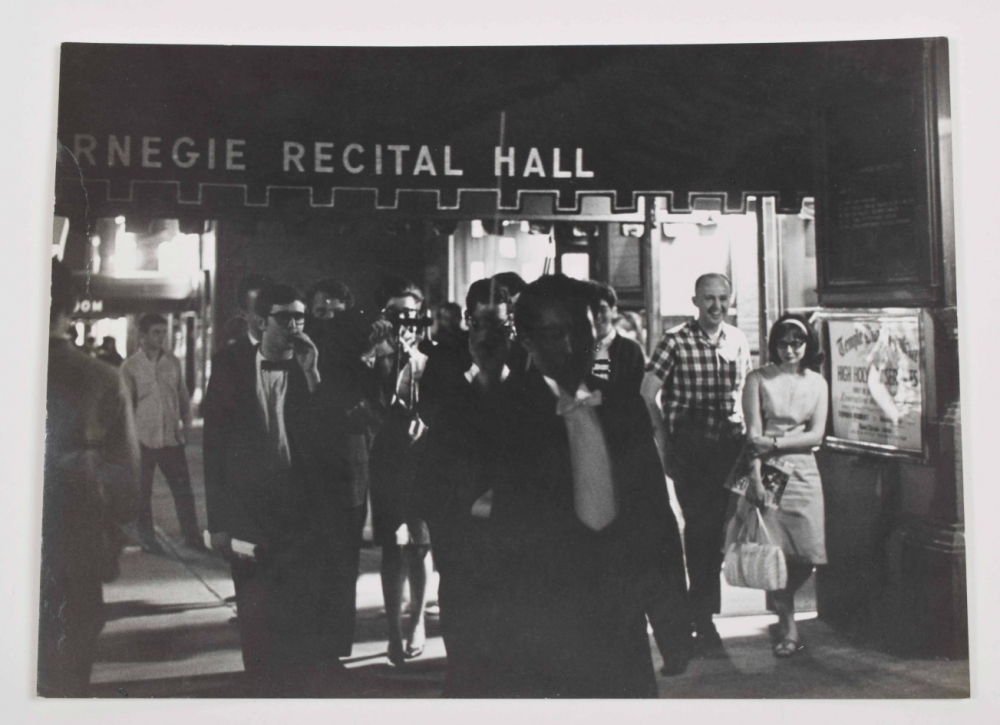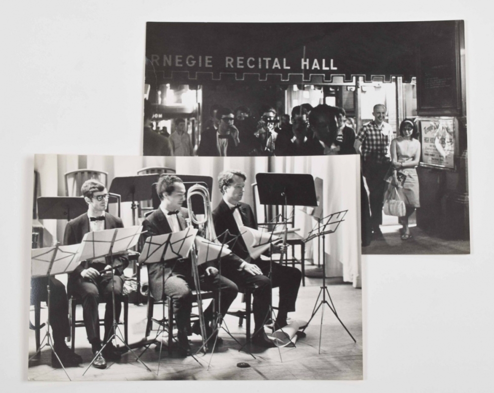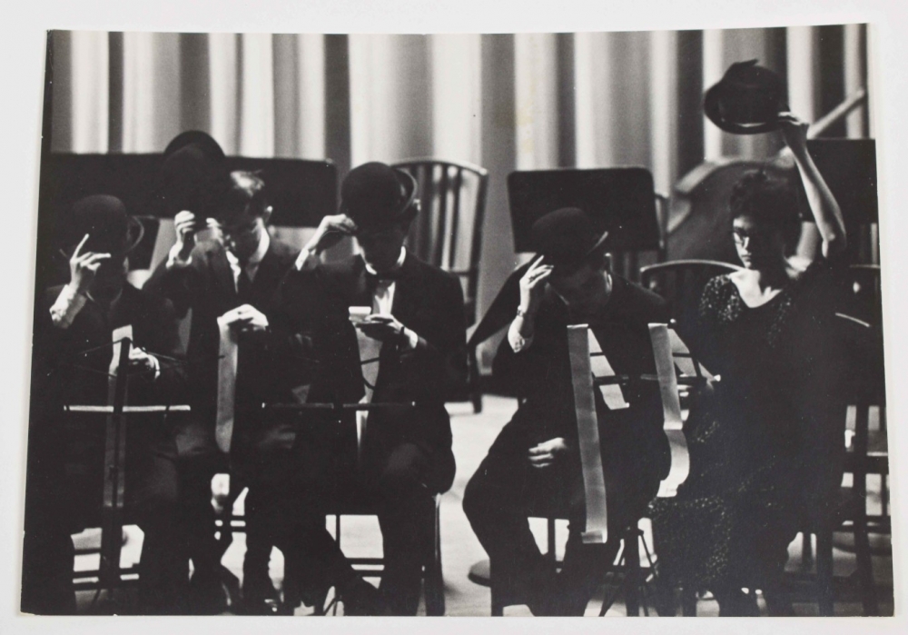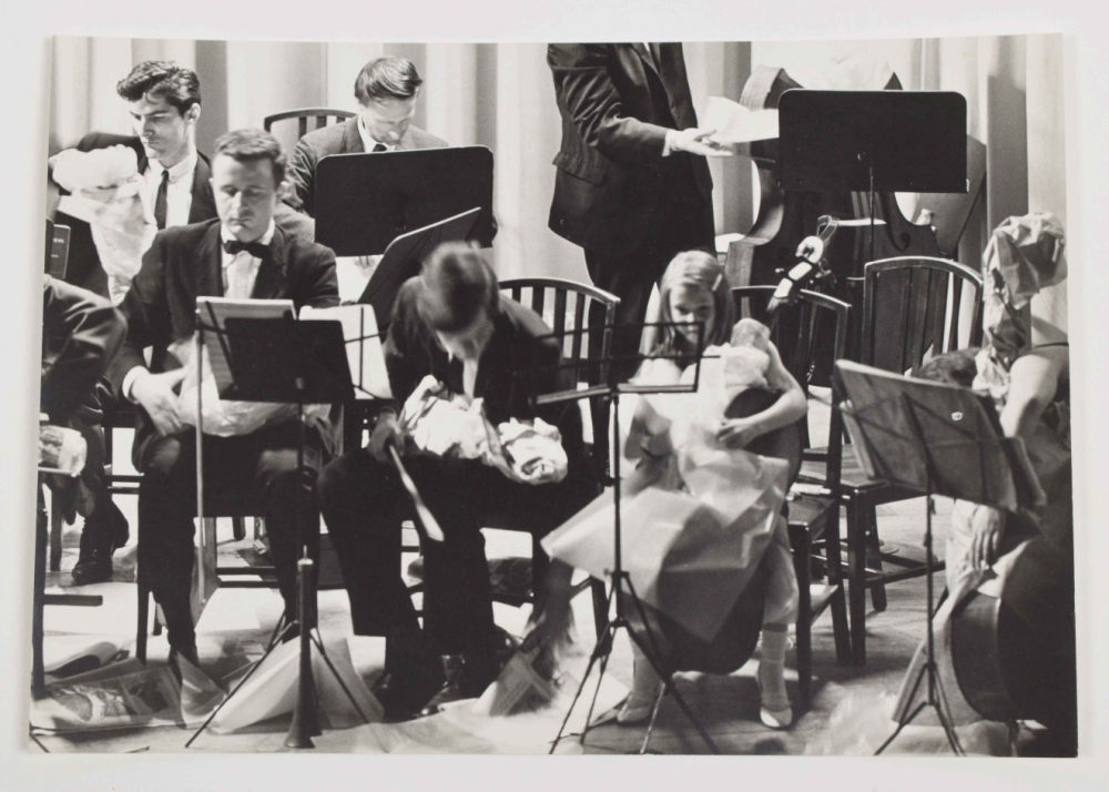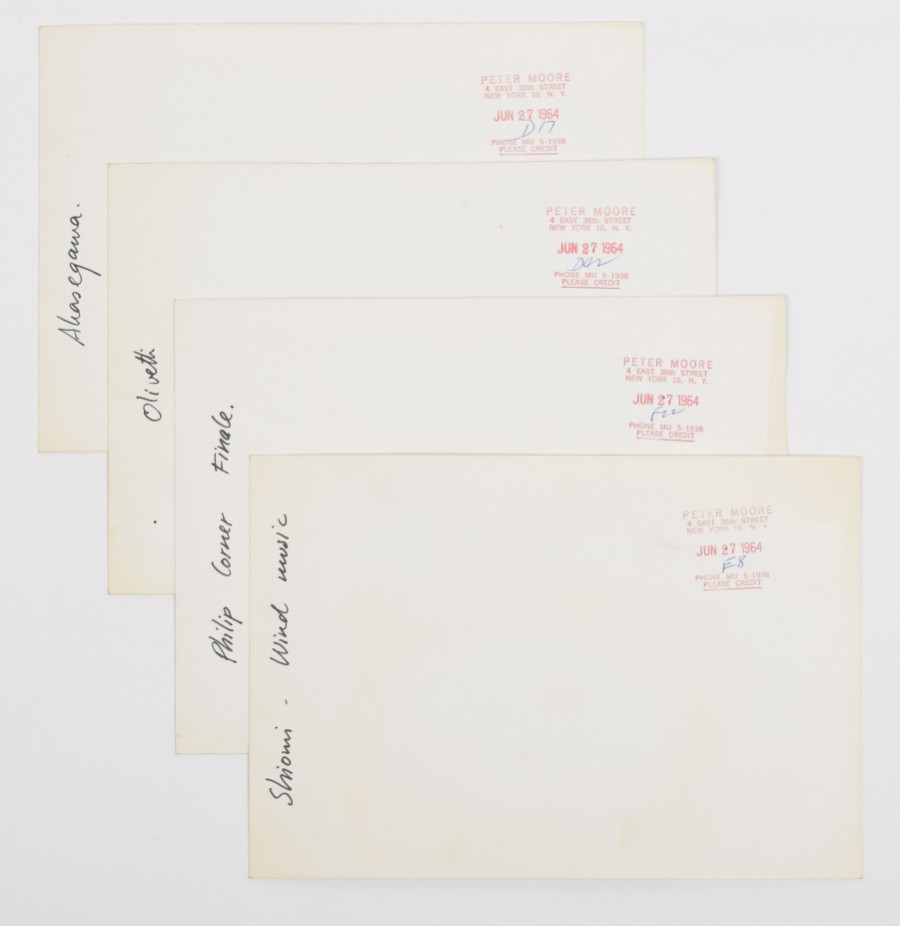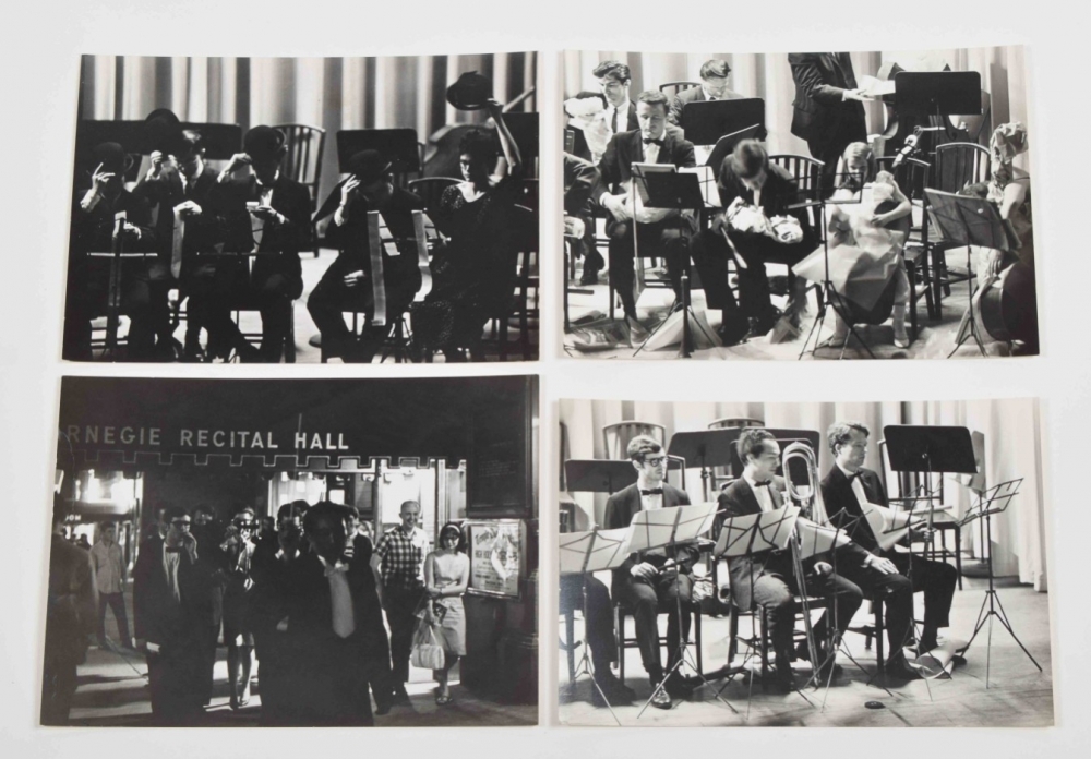 Four gelatin silver prints by Peter Moore. 20.5 x 25 cm. Credit stamp and date on verso. Features Fluxus Symphony Orchestra at Carnegie Recital Hall, June 27 1964. Shown are Shiomi's Wind Music, performance by Akasegawa Genpei, Maciunas' In Memoriam to Adriano Olivetti and Philip Corner's Finale.
