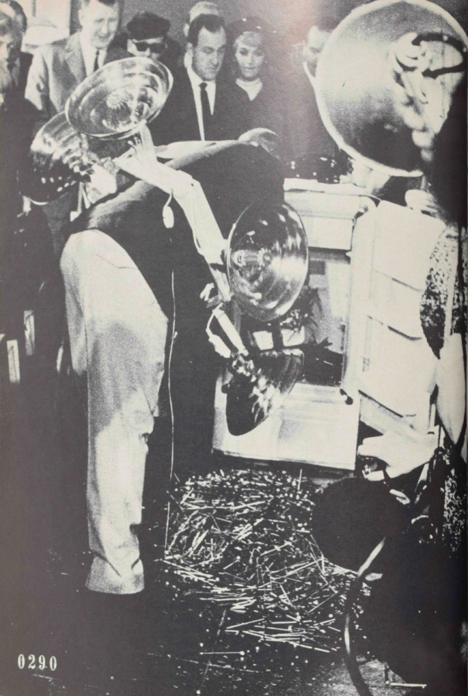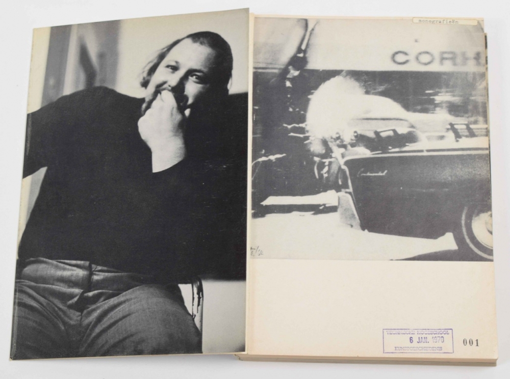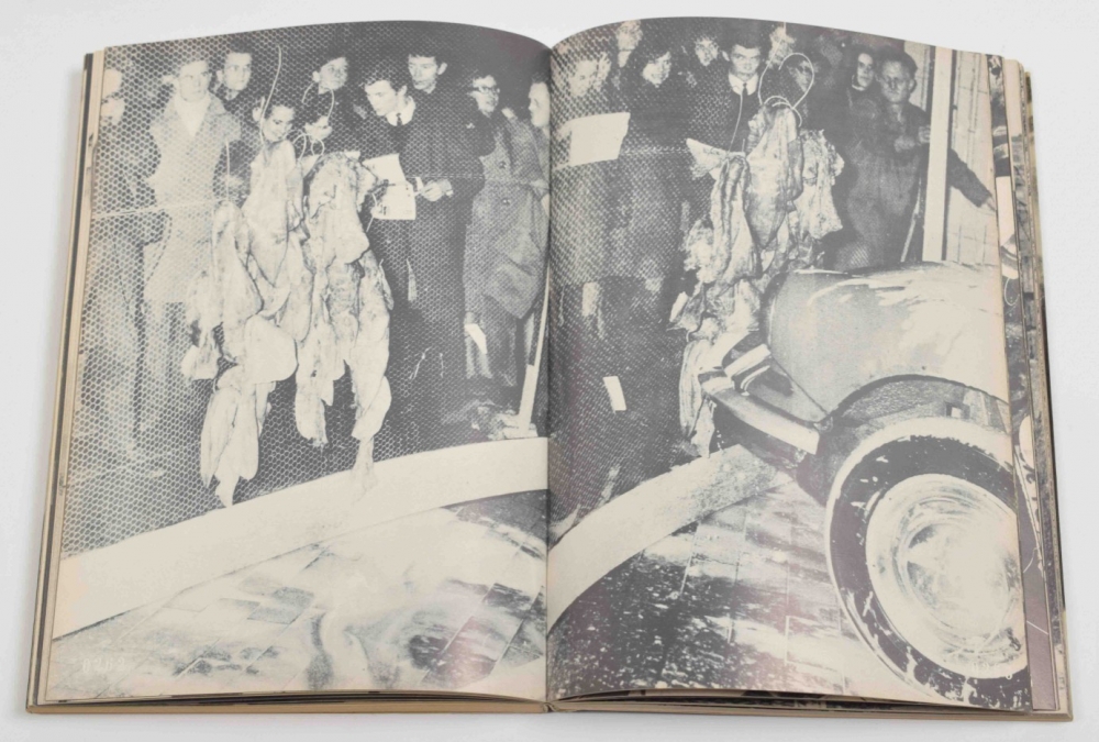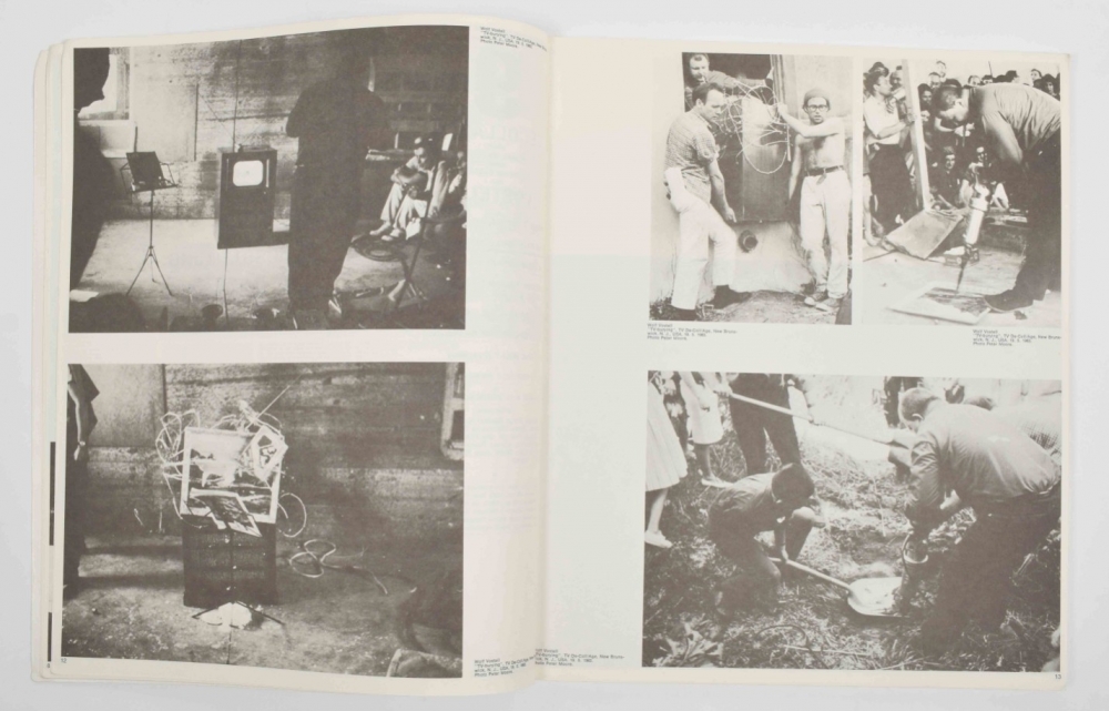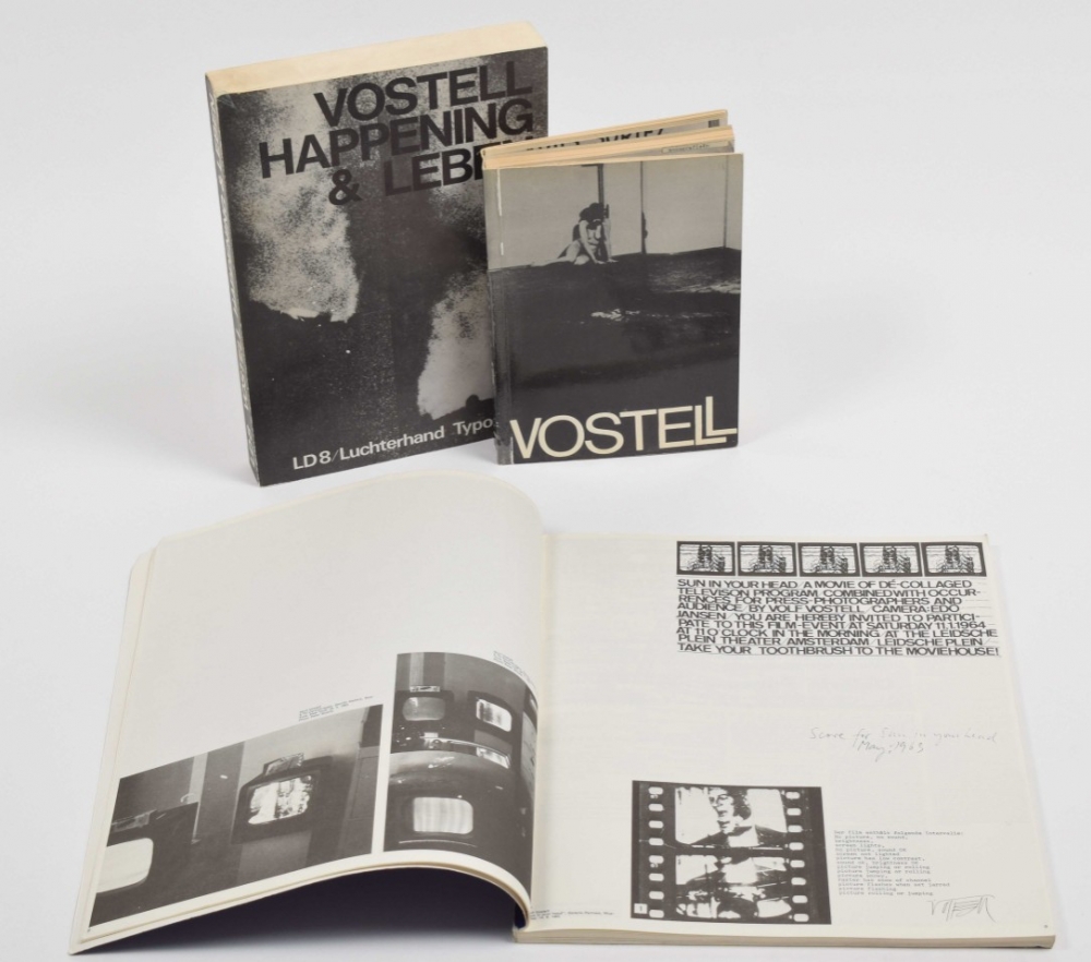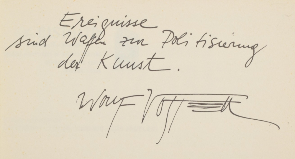 Signed copy of Wolf Vostell, Happening & Leben. Berlin, Hermann Luchterhand Verlag, 1970. Anthology documenting ten years of Vostells Fluxus happenings. Text mostly in German, some English. Signed on first page with text 'Ereignisse sind Waffen zur Politisierung der Kunst'. Slight aging around cover edges and spine, else very good.