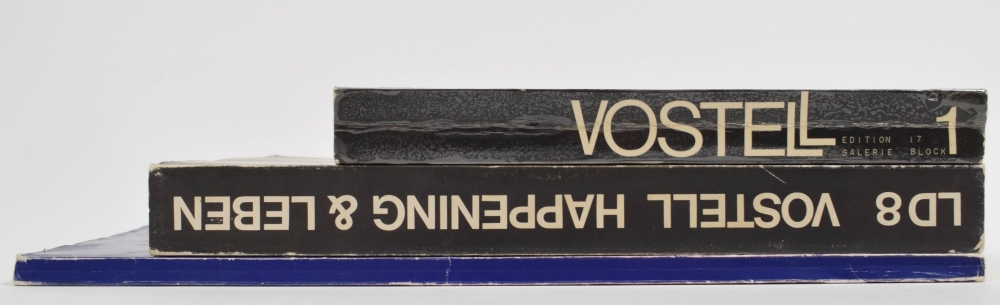 + Wolf Vostell De-Coll/agen 1954-69 Plakate Objekte Happening Partituren Fall Outs. Published by Galerie Rene Block, Berlin, 1969. Stamp and label of Deelstra's art library on first page. Cover aged and cellophane cracked on spine, interior in good condition. + Video End, Pfirsich 16-17-18, Juli 1976. Edited by Pool Horst. Large format magazine containing a special on Wolf Vostell. Text in German. Aging on cover and edges, else fine. Rare copy. (total 3)