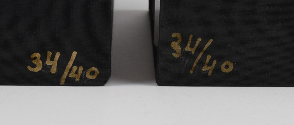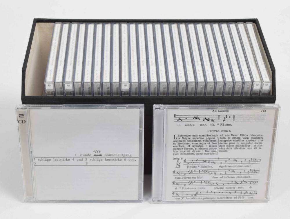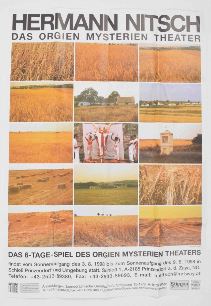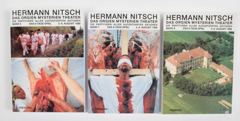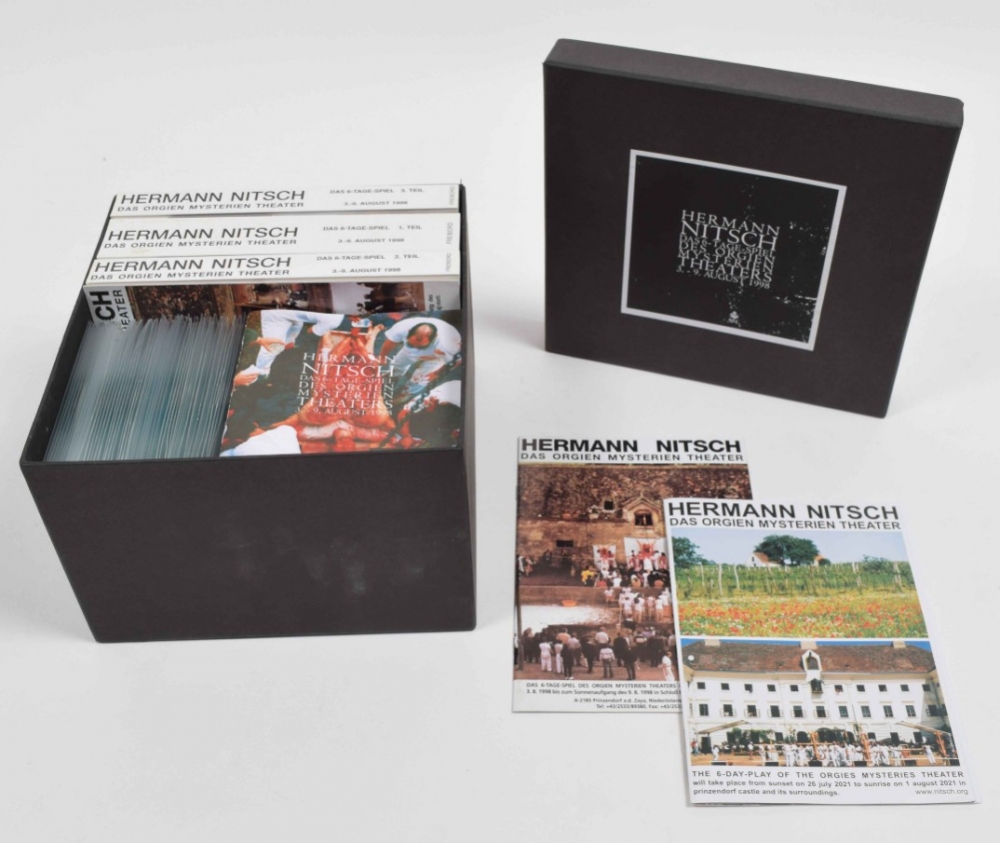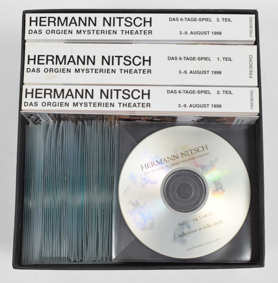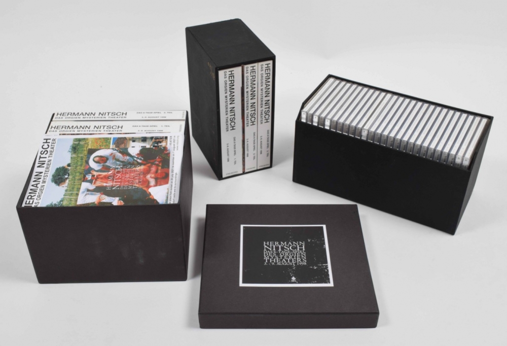 Das 6-Tage-Spiel des Orgien Mysterien Theaters. Limited edition box, no. 34/100. Contains: 51 CDs; accompanying books vol. 1-3. Vienna, Freibord, 1998. Incl. an inserted original drawing by Nitsch; 2 programmes (1998 and 2021); folded poster for the 1998 event, 83 x 58.5 cm. Added duplicates: Das 6-Tage-Spiel des Orgien Mysterien Theaters CD box with all 51 discs, together with the accompanying books vol. 1-3 in slipcase, with 1 folded poster for the 1998 event. Duplicates numbered 34/40.