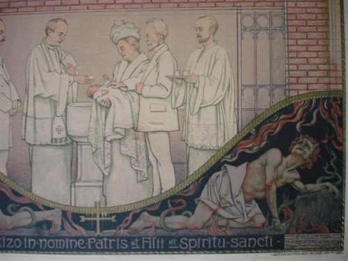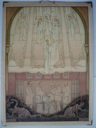 See the Dutch description: Liturgische Schoolplaat: "De Doop"Antoon Molkenboer. Uitgave Th. M. Beukers. Litho: Ellerman-Harms, Amsterdam, 1916. Met titel: "Ego te baptizo in nomine Patris et Filii et Spiritu sancti".