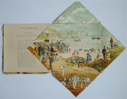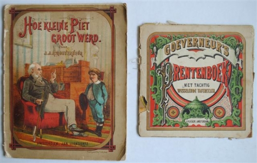 See the Dutch description: J.J.A. Goeverneur. Goeverneur's prentenboek met tachtig wisselende taferelen. J. Vlieger, Amsterdam, 1875. Beweegbaar prentenboek met 4 flapprenten met taferelen van circus, strand, picknick aan een vijver en Sinterklaas. Besch. exemplaar, aantal bladen los en 2 flappen ontbreken. + J.J.A.Goeverneur. Hoe Kleine Piet groot werd. Jan Leendertz, Amsterdam, ca. 1875, met 8 gelith. platen. (kaft los van boek).