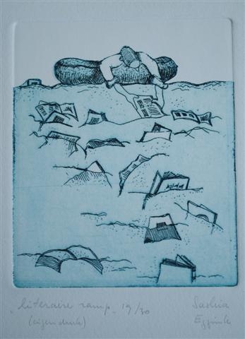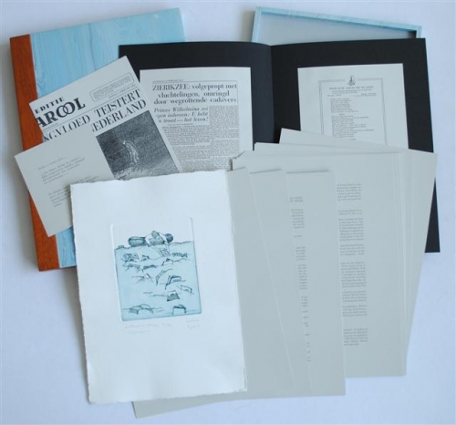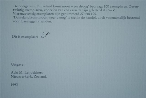 See the Dutch description: Duiveland komt nooit meer droog. Uitgave Adri M.Leijdekkers, Nieuwerkerk, 1993. Oplage 100 ex. waarvan 26 in luxe cassette, geletterd A tm Z. Dit is exemplaar S. Tekst ontleend aan 8 stukjes rondom de watersnoodramp 1953 in het Parool. Met bijlages en een eigen druk van Saskia Eggink. 'Literaire Ramp' 19/30.