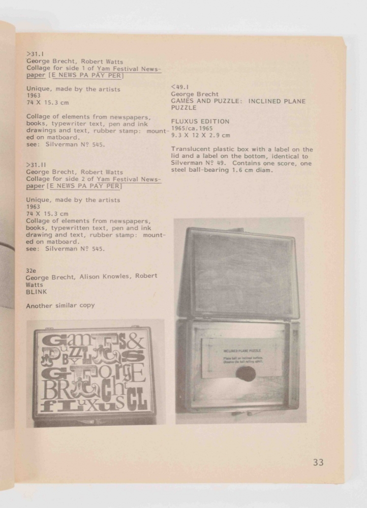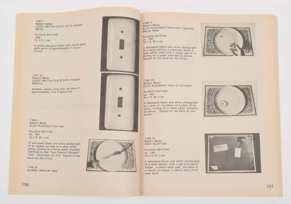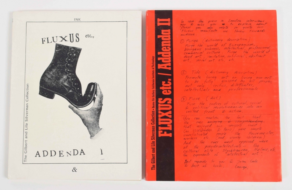 Fluxus Etc. / Addenda I and II. Pasadena, Baxter Art Gallery, 1983, 298 pp./ 439 pp. Exhibition catalogues edited by Jay Belloi, Melanie Hedlund and Hendricks, who also curated the exhibition. Includes b/w facsimiles and reproductions of Fluxus related ephemera and works by Fluxus artists. Both volumes have minimal wear on cover, interior is mint.