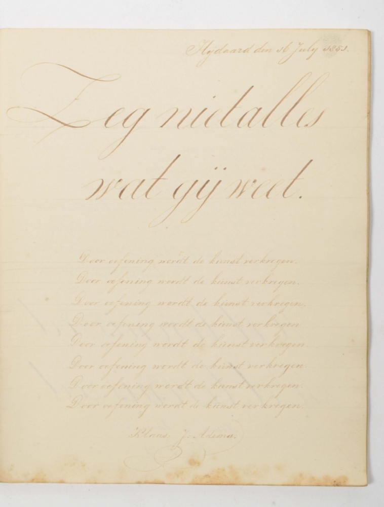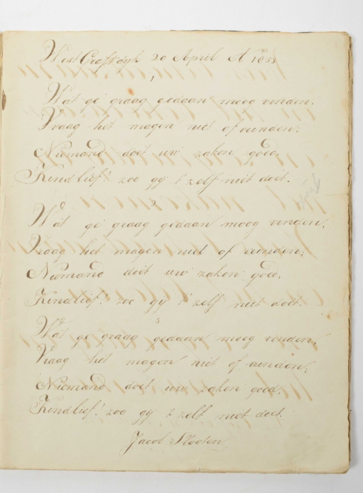 (1) Notebook written in Nichtevecht (Nigtevecht), 1808. 50 p.; (2) Notebook by W.H. Hofstra, written in Hidard (Friesland), 1851. 40 p.; (3) Notebook by Jacob Slooten, West Grafdijk, 1853. Consisting of both calligraphic text and poetry. 80 p.