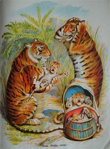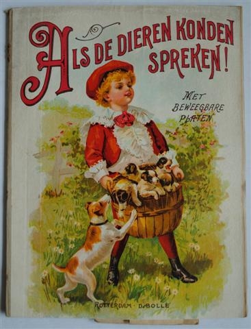 See the Dutch description: Als de dieren konden spreken! Rotterdam, D.Bolle, ca 1890. 10 pag. met 4 beweegbare chromolitho's. Afb. van de negerzanger en de leeuw, de negervrouw en de olifant, drie apen en een tijger en tijgerpaar met kindjes.
