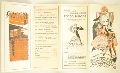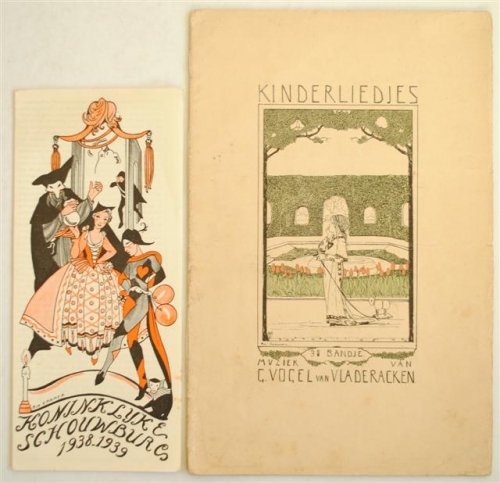 See the Dutch description: Aanbiedingsfolder Coupon-boekjes Koninklijke Schouwburg, Den Haag, seizoen 1938-1939. Vouwblad. Voorkant tekening Rie Cramer. + VOGEL VAN VLADERACKEN, GEERTRUIDA. Kinderliedjes. 3e bandje. Woorden en bandversiering van RIE CRAMER. Muziek van -. Amsterdam, Alsbach, 1956. 15 p. Ing. (totaal 2)