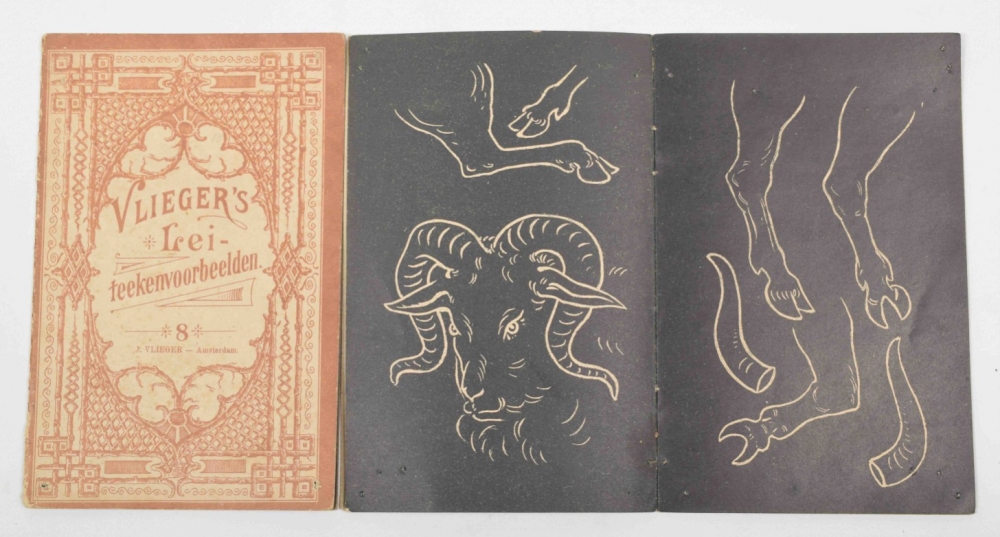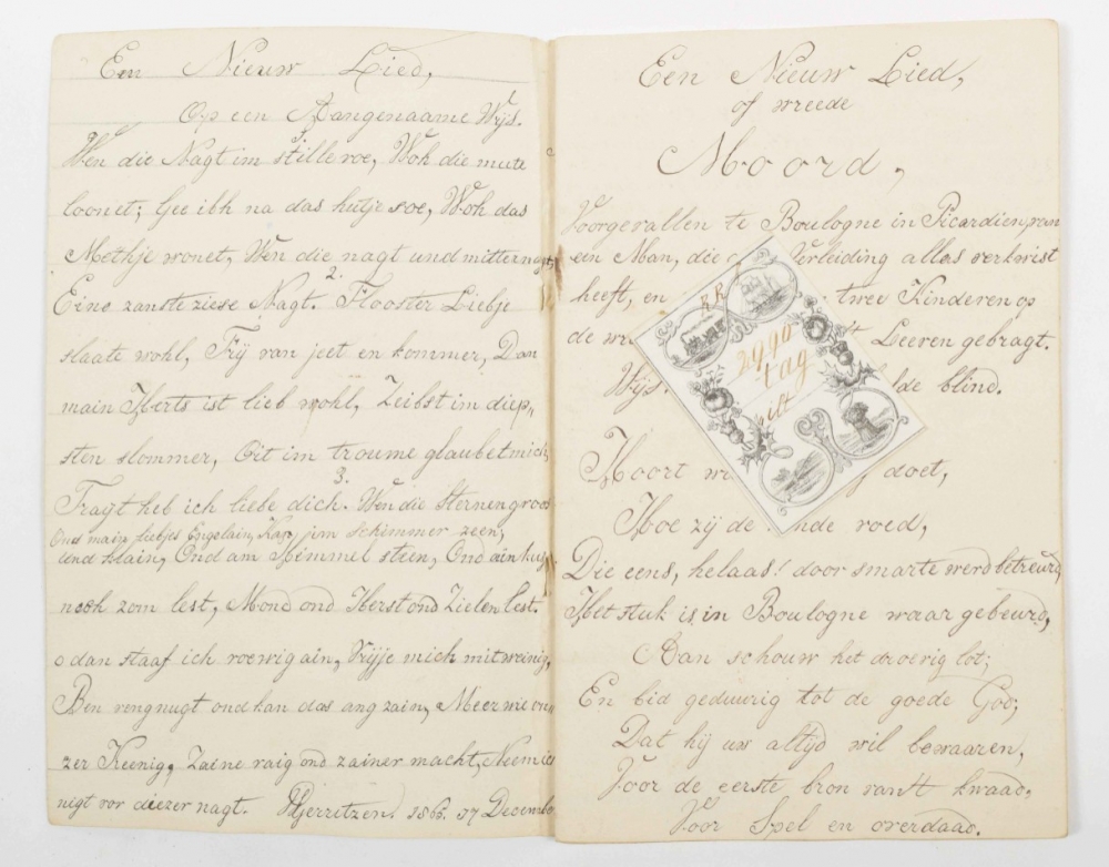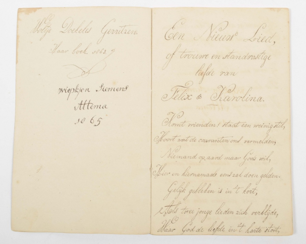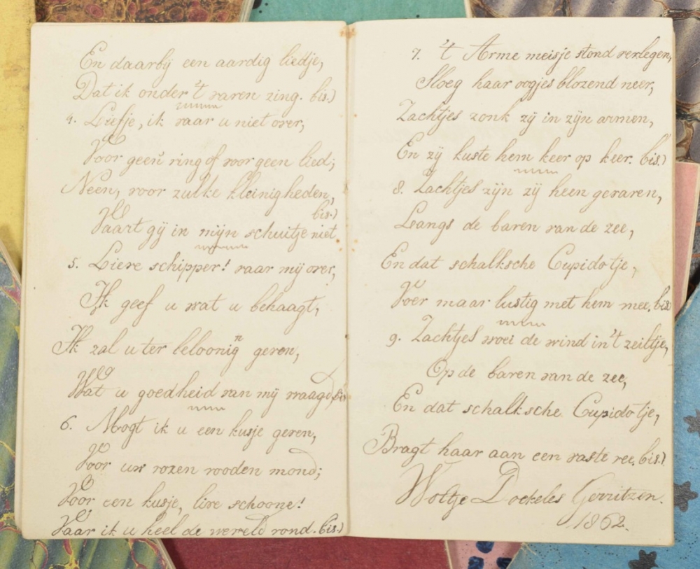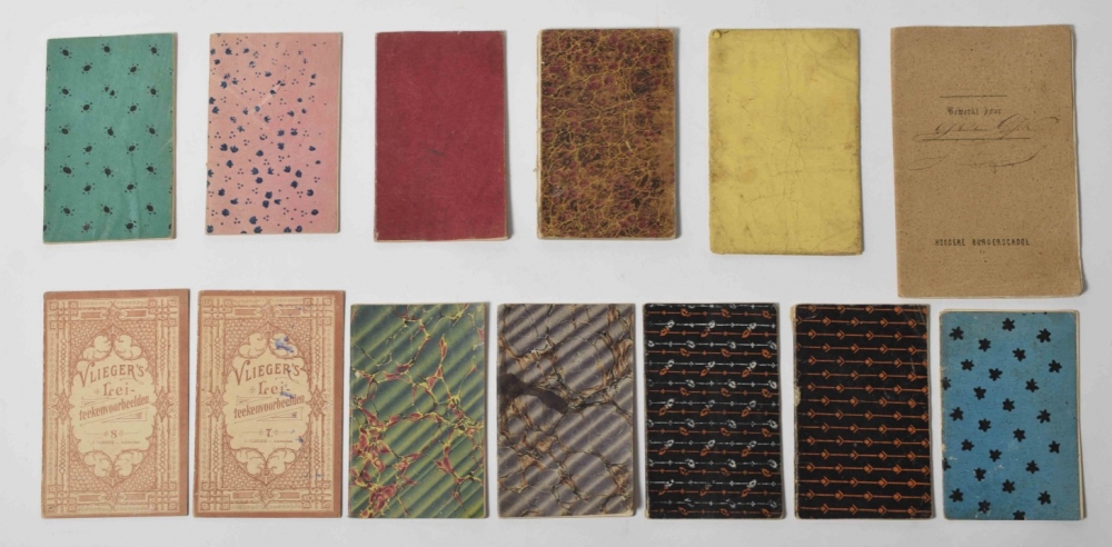 Lovely set of personal booklets, providing insight in 19th-century Frisian culture. Conveniently enough, an album with photographic portraits of members of the family Dijkstra-Gerritzen, now preserved at Museum Warkums Erfskip (available online), contains portraits of both Woltje and Jeltje. A few song titles: "Een nieuw lied van een Vlaamsch meisje met een Franschman"; "Het gestolen kind, of de Wedergevonden ouders"; "De vrolijken goede vrijer" and "Een nieuw lied, of Wreede moord". A highly interesting booklet dated 15 November 1874 contains a vision by Jeltje that she had on 9 October 1860, between 12 and 2 o'clock at night. She encountered an angel and a demon walking back home. And 4 similar booklets, with texts by Anne Tjitzes Rijpkema (1846-1930) and others. Added: Vlieger's Lei-teekenvoorbeelden 7 and 8. (total 13)