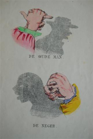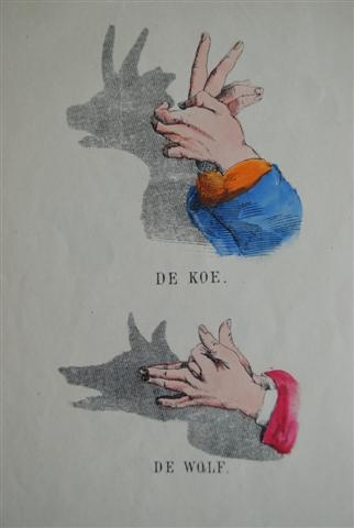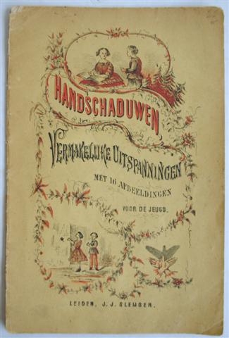 See the Dutch description: Handschaduwen. Vermakelijke uitspanningen. Met 16 afbeeldingen. Voor de jeugd. Leiden, J.J. Sleijser, z.j. 16 handgekl. gravures op 8 pag. met voorbeelden van handschaduwen. Vooral dieren.