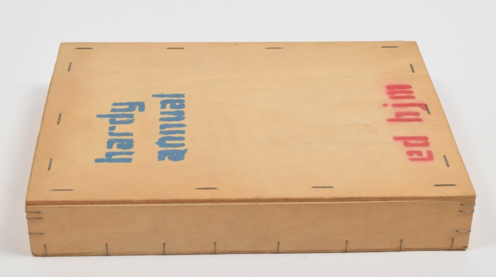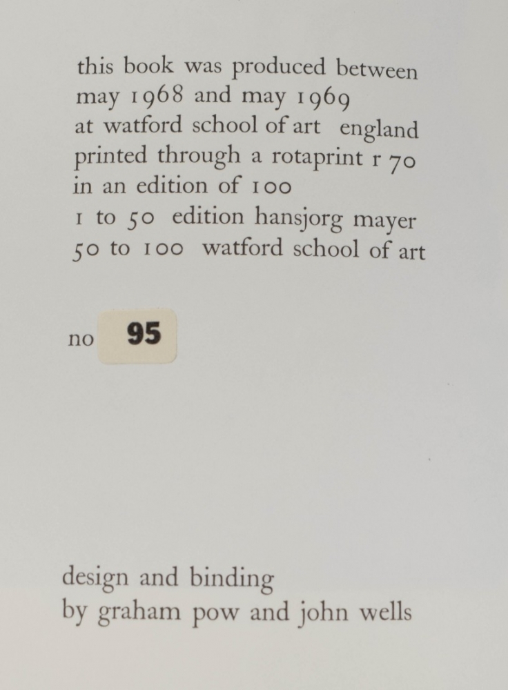 Issued in a wooden box with spray painted title. Cover printed on metallic sheet. Edition of 100, with the first 50 retained by Mayer, and the school retaining the last 50. This is number 95/100. Participants: Richard Buckley, Ian Burton Elliott, Frank Challenger, Veronica Loveless, Hansjorg Mayer, Graham Pow, Kathryn Wallbridge, Cilla Weeks, John Wells. In very good condition.