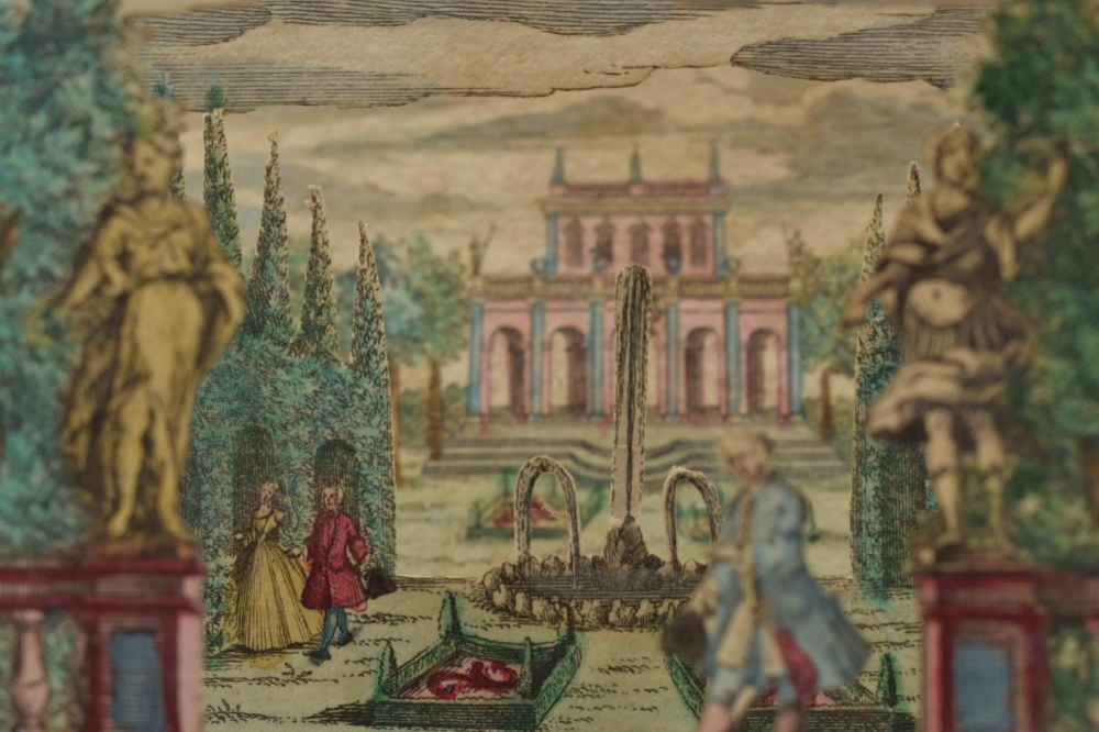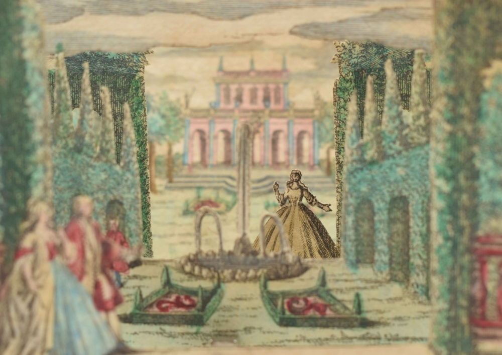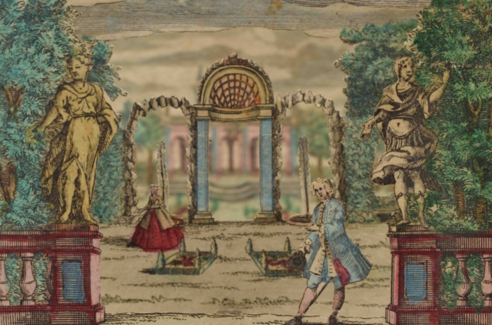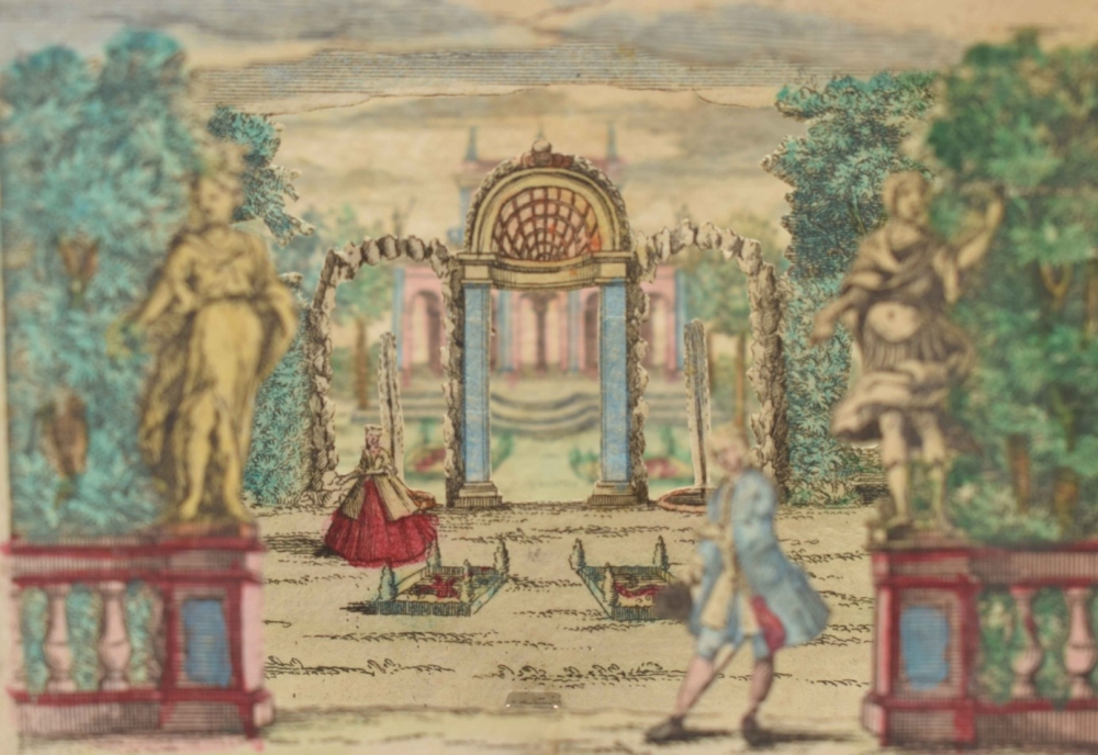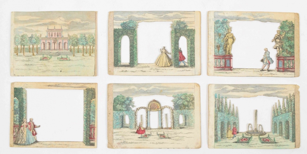 Perspective scene. Complete set, comprising 6 contemporaneously handcoloured engraved scenes. Augsburg, M. Engelbrecht, c. 1780. 7.2 x 10 cm.