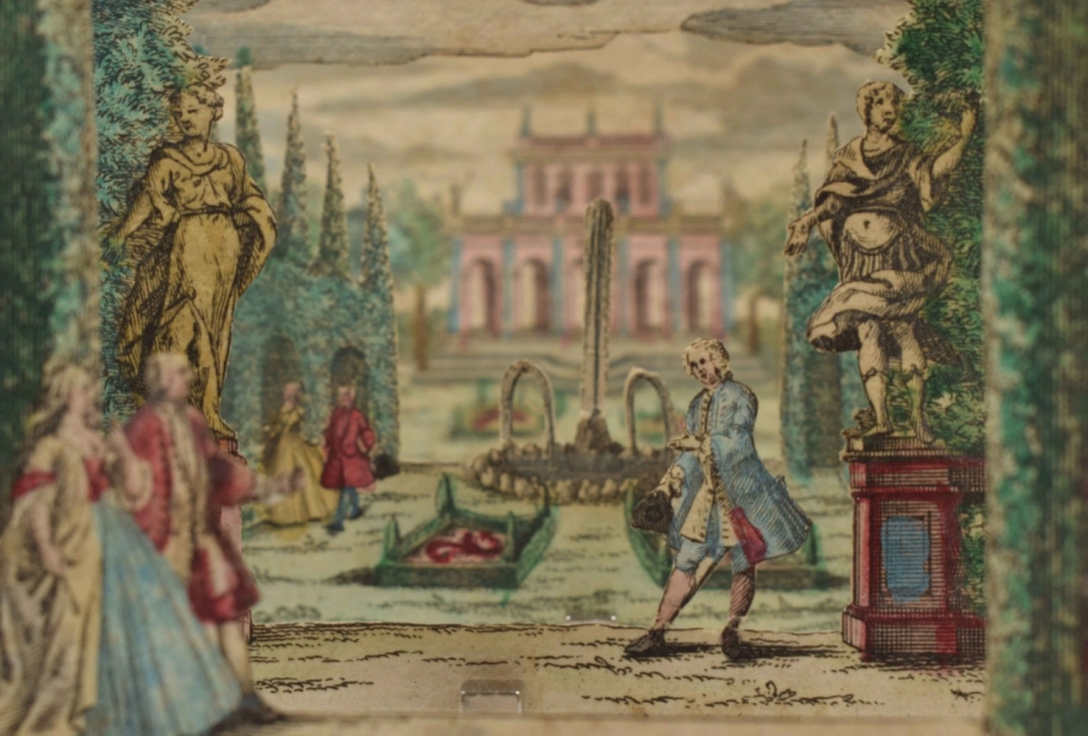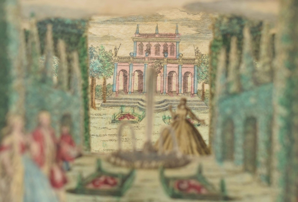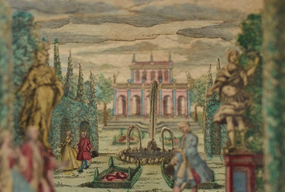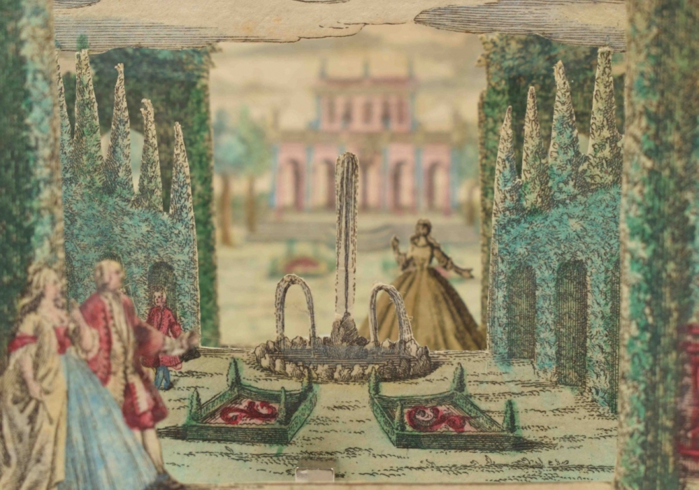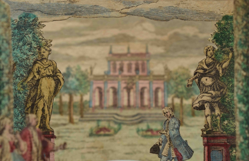Perspective scene. Complete set, comprising 6 contemporaneously handcoloured engraved scenes. Augsburg, M. Engelbrecht, c. 1780. 7.2 x 10 cm.