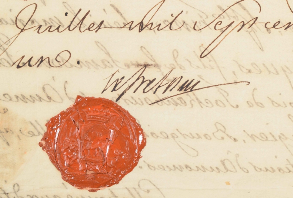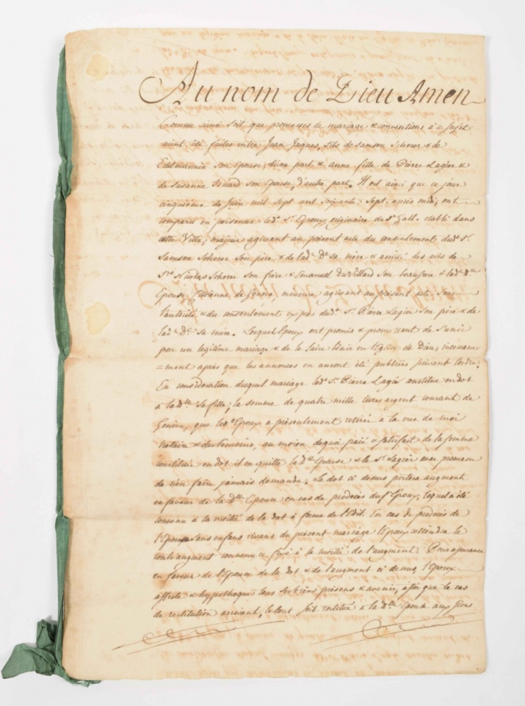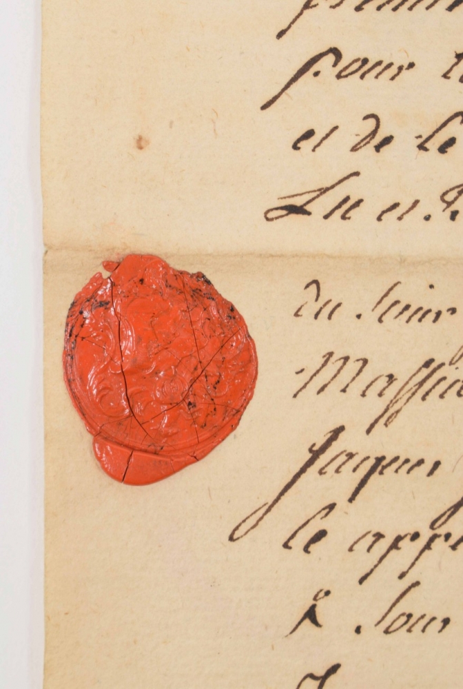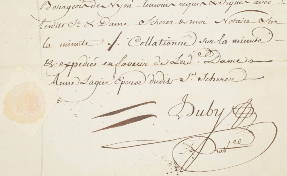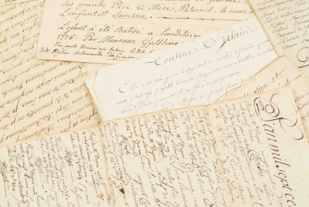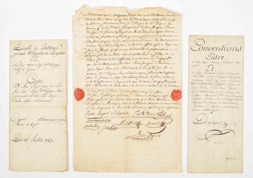 comprising ± 100 notarial, financial and government documents on paper dated 1758-1851, some with wax seals, mainly related to the Scherrer/Schérer family from Geneva, partly documents concerning watchmakers from Geneva.