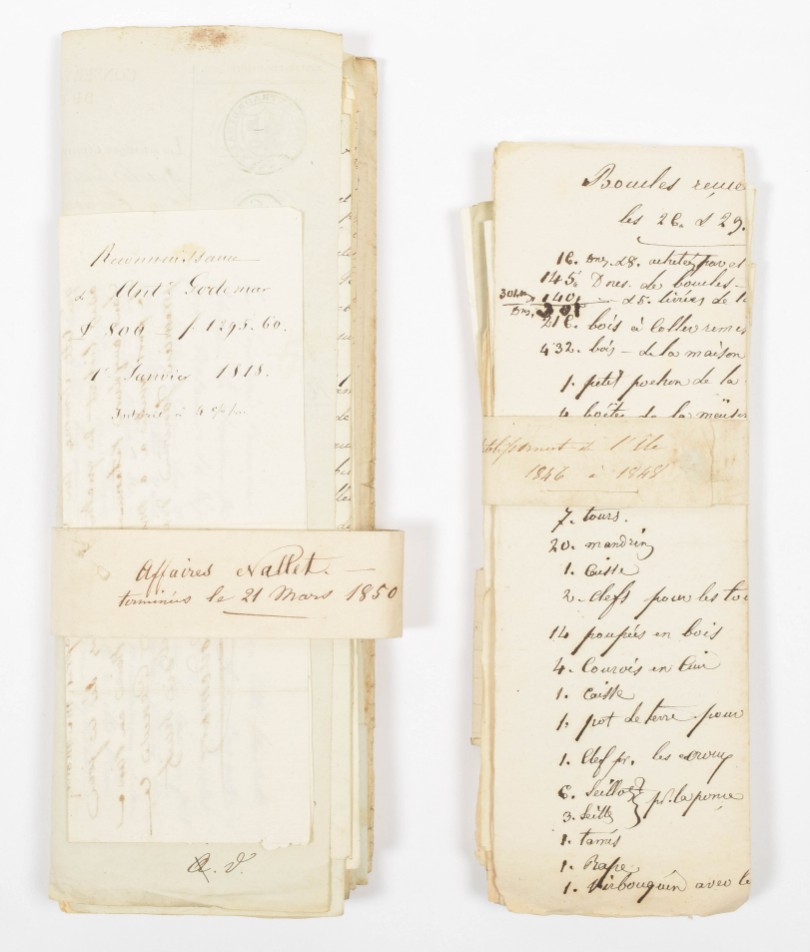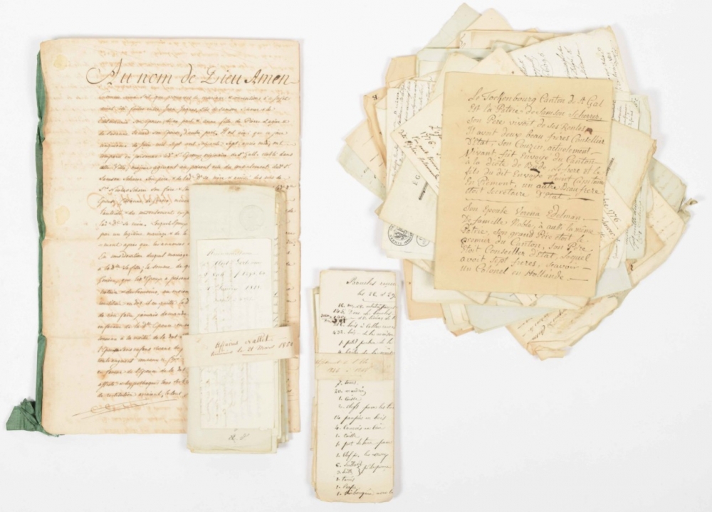 Comprises for example 9 documents held together by a paper wrap "Salines de l'État" (on the Compagnie des Salines et Mines de Sel de l'Est); over 20 documents held together by a paper wrap "Établissement de l'Isle 1846-1848; a small stack of documents held together by a paper wrap "Affaires Nallet terminé le 21 mars 1850", and documents concerning Comte de Alexande Charles Serrurier (1818-1887), Jean-Jacques Scherrer ("organiste habitant de Geneve"), incl. "Contrat de Mariage (1767), Samson Shérer (1807); Schérer Frères Genève, Jean Étienne Schérer "Horloger natif de Genève" (passport, 1805), "Jean Antoine Capt. Mtr. Horloger, Natif de Genève" (1763), "Jean Pattey Mtre. Horloger" (Geneva, 1758) "Abraham Pape maitre Horloger habitant de Genève" (1761). (total ± 100)