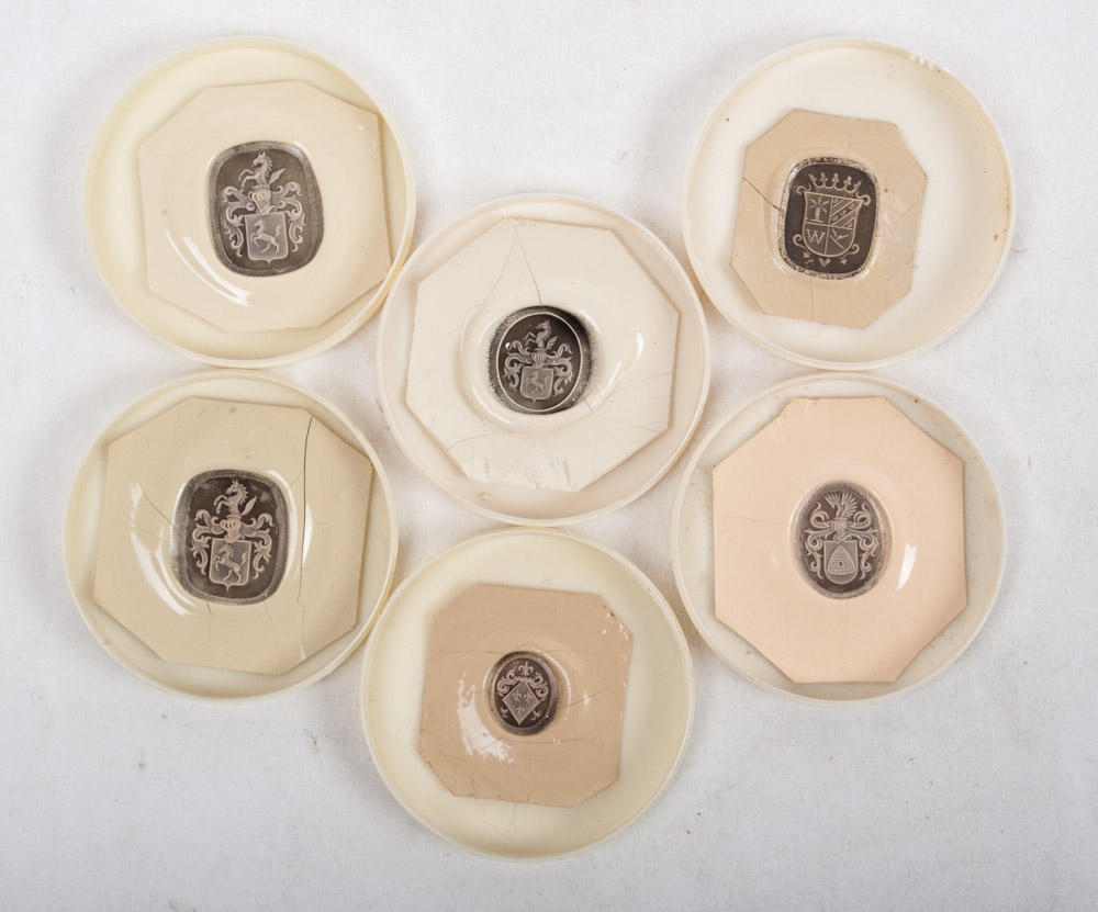Blue binder: ca. 152 partly unidentified wax seals, such as seals on business cards (Heinrich Prinz von Schönberg Waldenburg, A.J.H. Baron van Lijnden, Jhr. J.E. de Brauw), and seals identified on the back, e.g. d'Ablaing van Giessenburg, Jonkheer van Haeften, Van Heemskerk, Copmte et noble seigneur de Lippe Biesterfeld, Comte Oberndorf, Gräfin von Reichenbach, De Ruyter van Steveninck, de Simonis, graaf Zedtwitz and seals identified on the front, such as Gleiberger Ampt-Siegel (1703), Fürstl. Nassau-Weilburgisches Forstsiegel