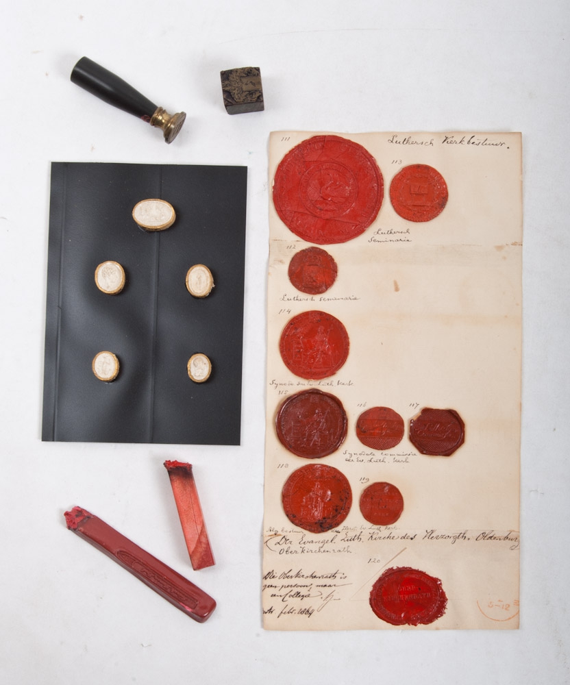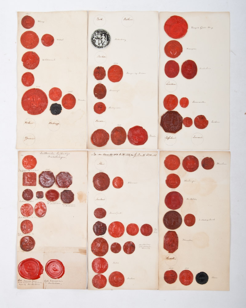 Grey binder: 134 wax seals of the Lutheran church authorities, Lutheran charities and Dutch places such as Alkmaar, Amsterdam, Arnhem, Beverwijk, Brielle, Delft, Den Haag, Deventer, Edam, Enkhuizen, Gouda, Groningen, Harlingen, Kampen, Maastricht, Medemblik, Meppel, Middelburg, Monnikendam, Nijmegen, Pekela, Rotterdam, Sappemeer, Tiel, Utrecht, Vaals, Weesp, Wildervank, Woerden, Zierikzee, Zutphen and Zwolle. Also ca. 100 stamped municipal seals on paper.