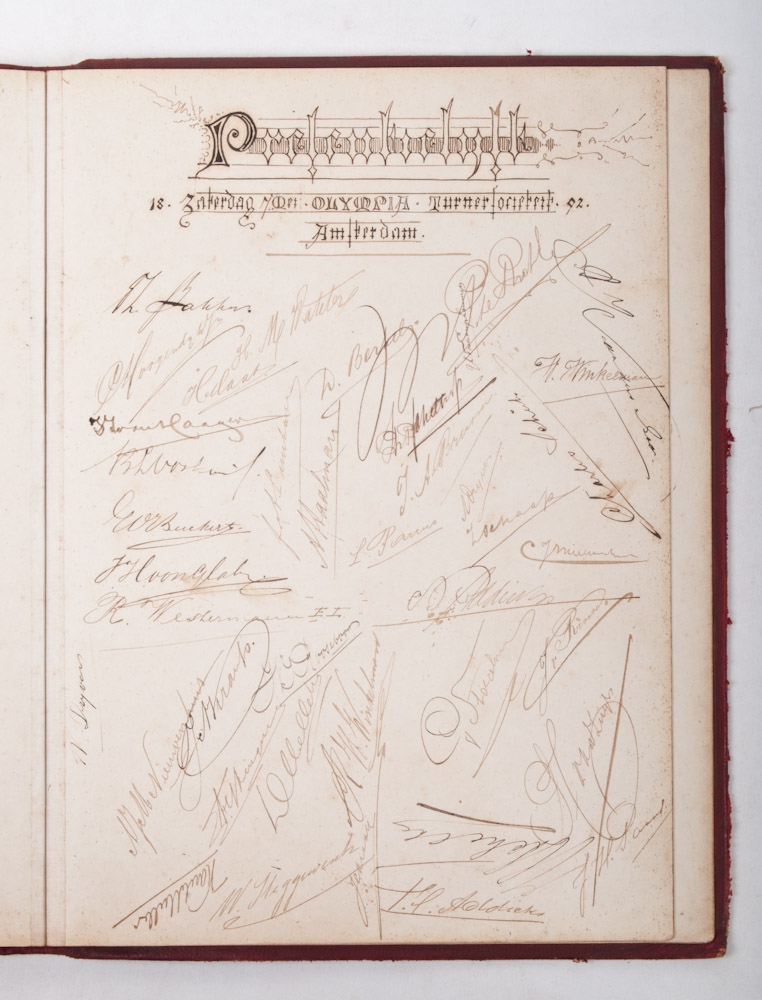 Vriendenboek bij het afscheid van G.H. van den Berg, 1892 (album amicorum) 36 pp. 4to dark-red calf, rubbed. Hand-drawn frontispiece and personal messages from all his fellow gymnasts. Last page contains all their signatures.