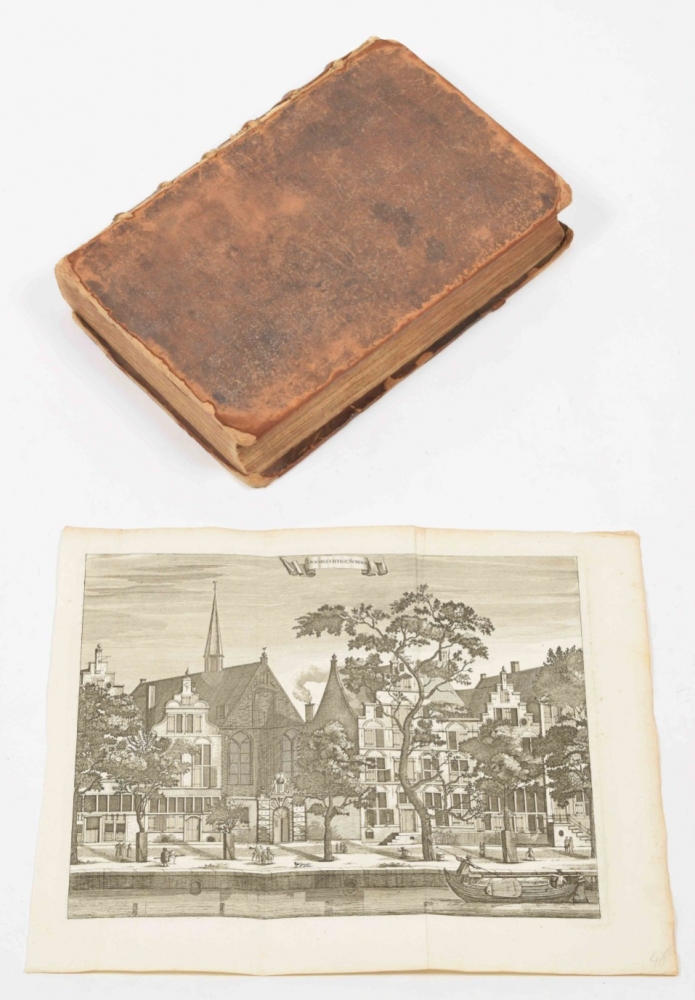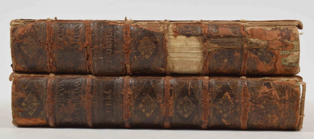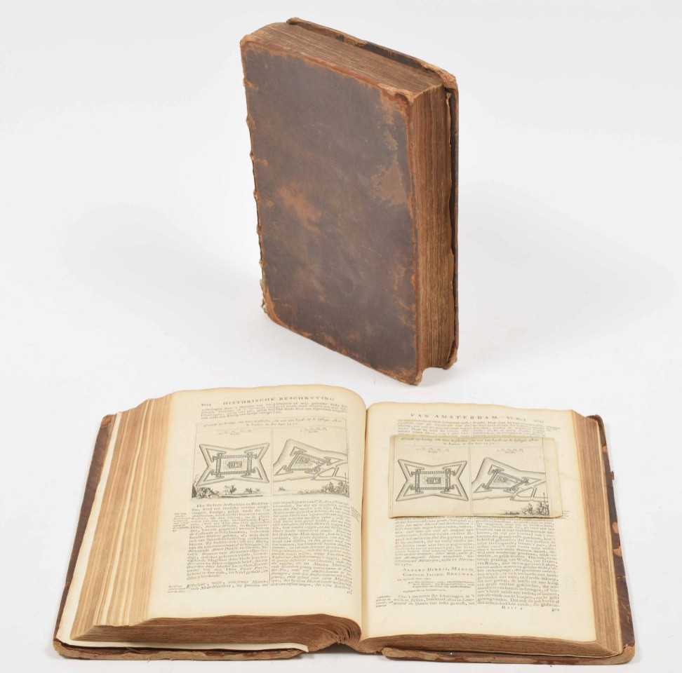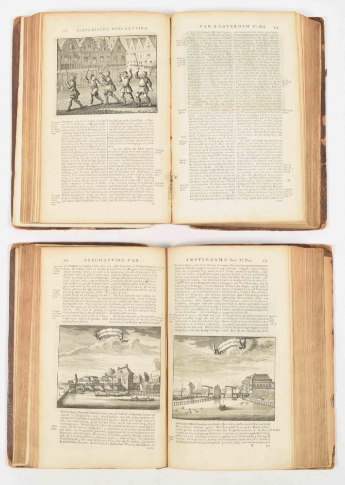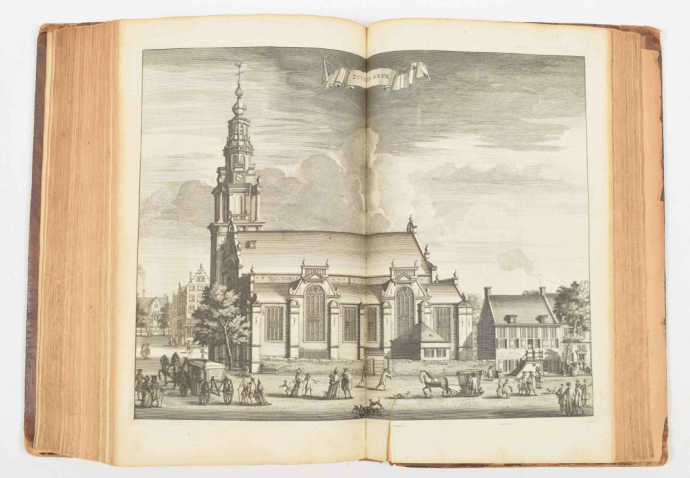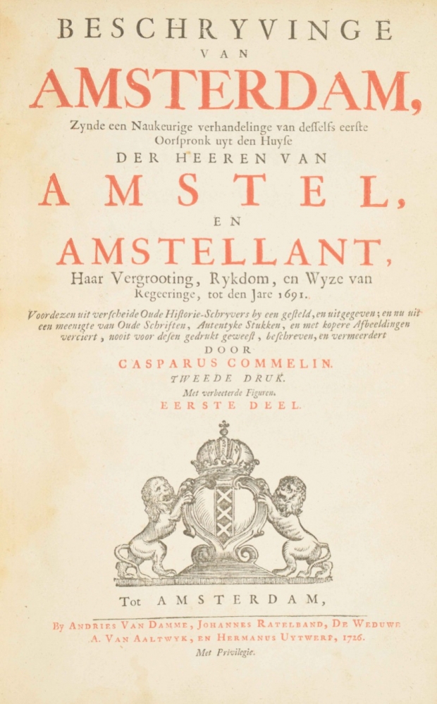 Zynde een naukeurige verhandlinge van desselfs eerste oorspronck (...) en nu uit een meenigte van oude schriften, autentyke stukken, en met kopere afbeeldingen verciert. Casparus Commelin. Amsterdam, Andries Van Damme, Johannes Ratelband, De Weduwe A. Van Aaltwyk, & Hermanus Uytwerf, 1726. 2 vols. (22), 600; (1), 601-1223, (41) p. engraved frontispiece, 36 (of 52) engraved plates (mostly double-page, some folding) and more than 75 engravings in the text. Leather, uniformly bound, folio.