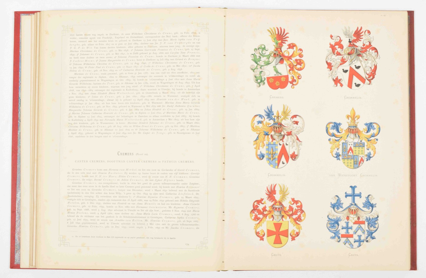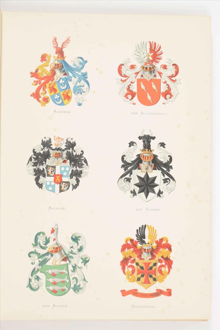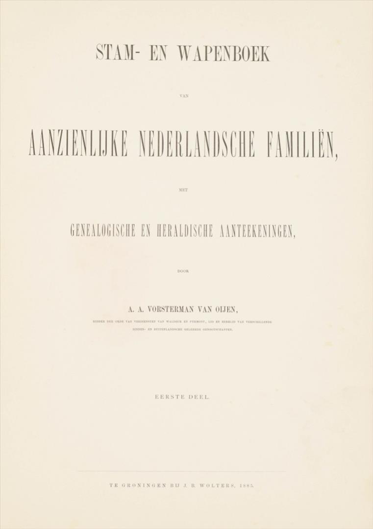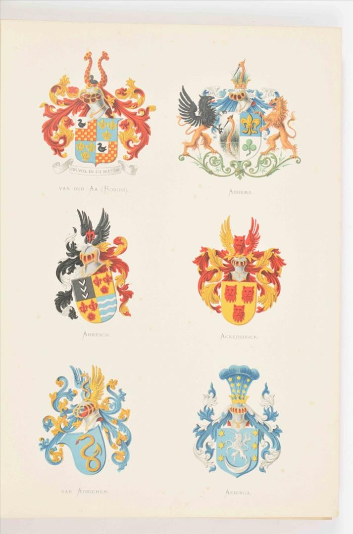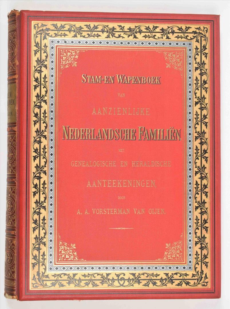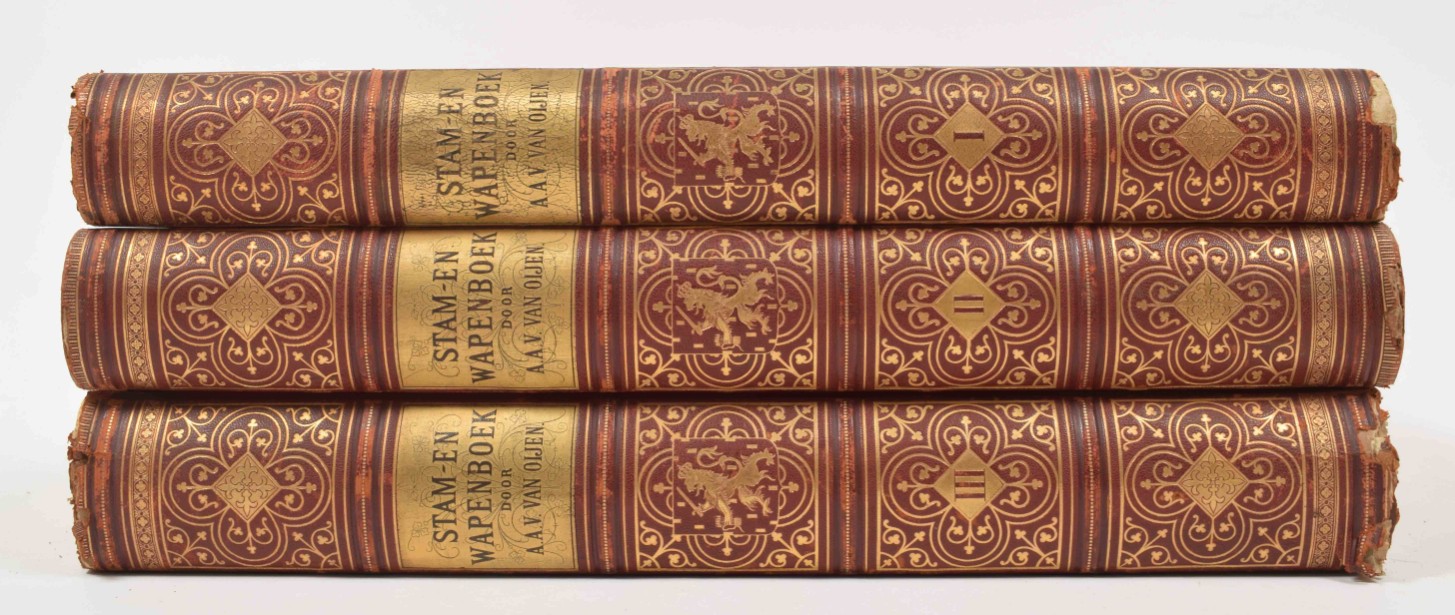 met genealogische en heraldische aanteekeningen. A.A. Vorsterman van Oijen. Groningen, J.B. Wolters, 1885-1890. 3 vols. (6), 359, (4); (6), 415, (4); (8), 502, (19) p. With 105 coloured plates, each with 6 coats of arms. Gilt halfleather, gilt edges, large folio. Spines vol. 1 and 2 sl. dam., some edgewear, vol. 3 a bit shaky in binding, some pages loose.