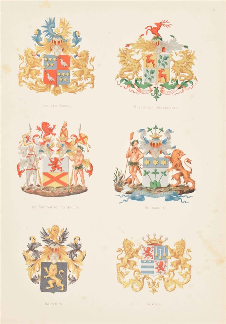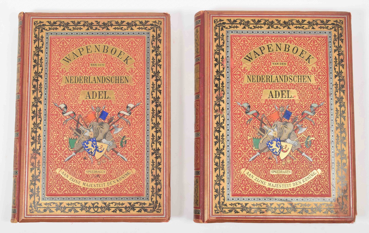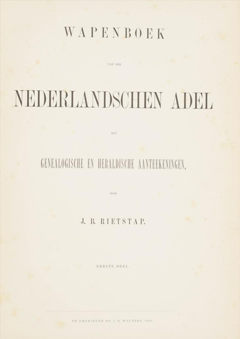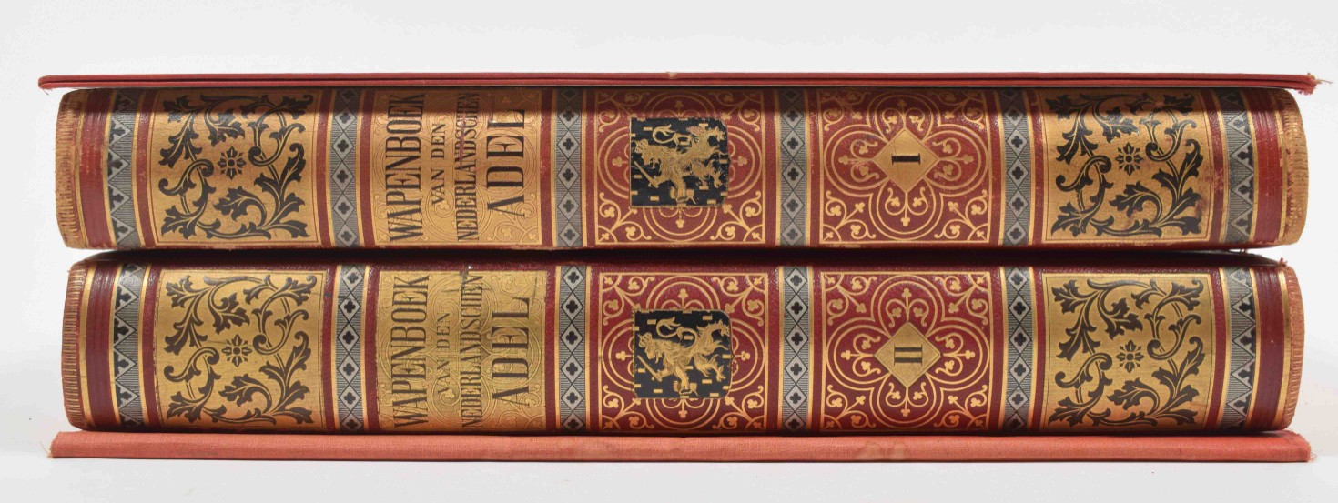 van den Nederlandsche adel, met genealogische en heraldische aanteekeningen. J.B. Rietstap. Groningen, J.B. Wolters, 1883-1887. 2 vols. xiv, 239,(5); vi, (22), 334 p. With 105 coloured plates with coats of arms. Richly gilt and decorated halfleather, uniformly bound. Binding sl. worn, occ. sl. foxed/browned, front endpaper with some waterstaining.