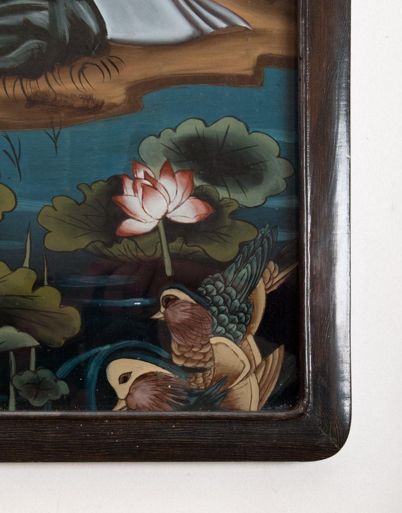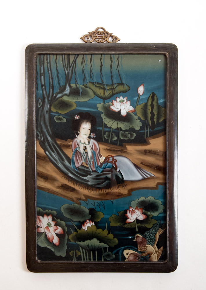 Under glass, depiction of young geisha near water, with waterlilies. China 20th century. Size image 46 x 29cm. Framed.