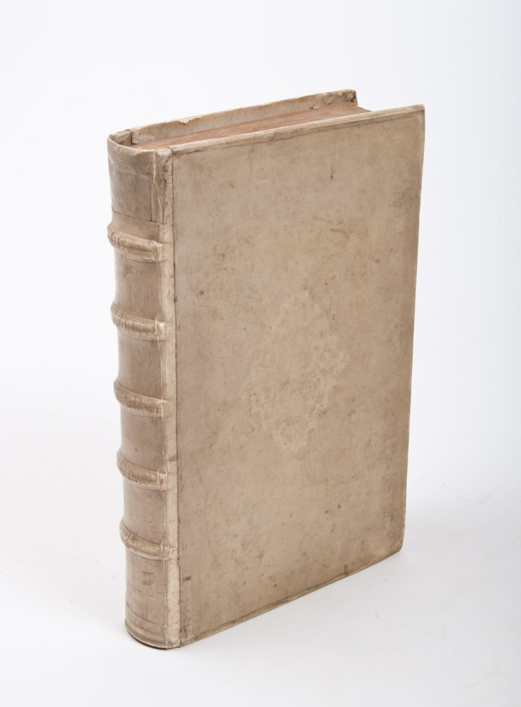 Small folio, parchment, blind-stamped sides, 3 title pages, 2 of which with large printer's vignette, (6),400,(16),98,69,(8) pp., endpapers renewed, various pages browned, good copy.