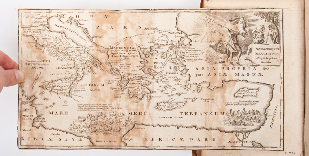 8vo., leather, ill. frontispiece, title in red and black, (22),610,222 pp., incl. 16 copper engravings and a map of the Mediterranean that has been repaired by pasting in several places. In fair condition, together with part II. and III. of Ovid's works in an Elzevier edition of 1652. (3 in total)