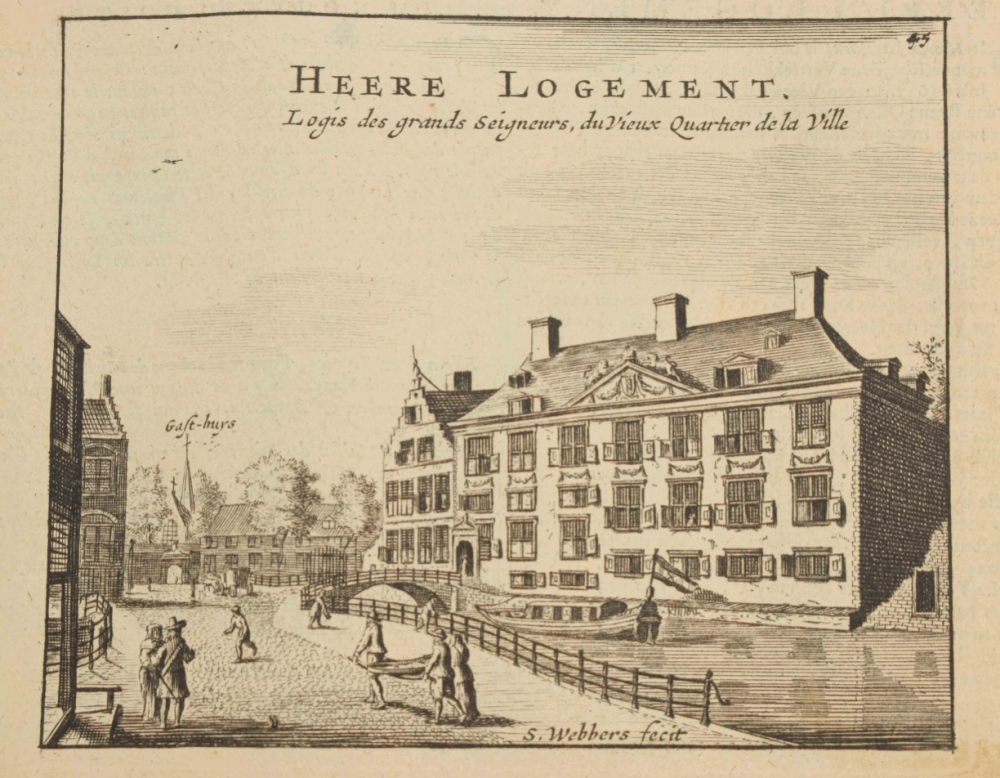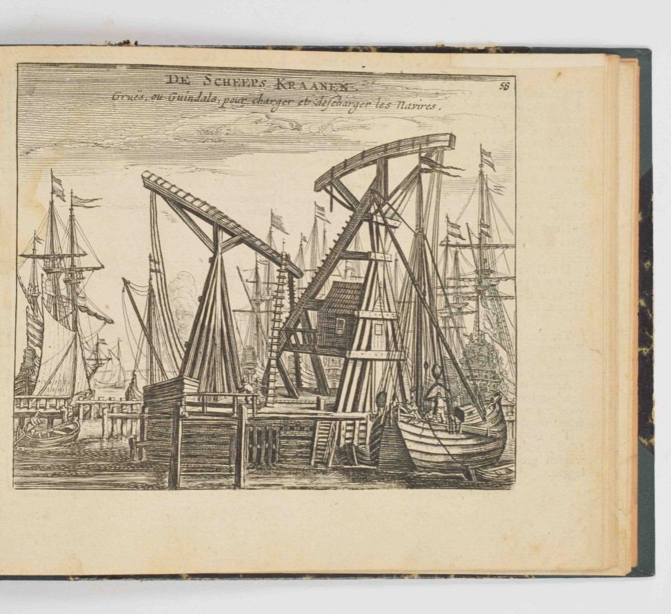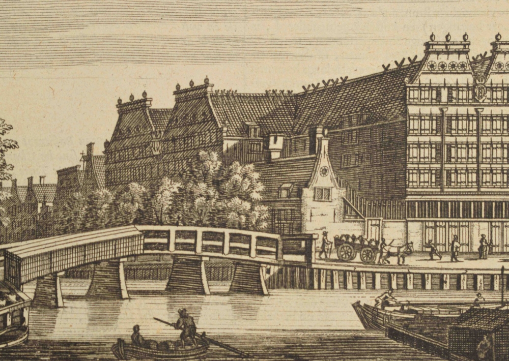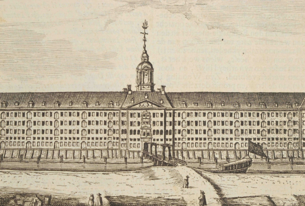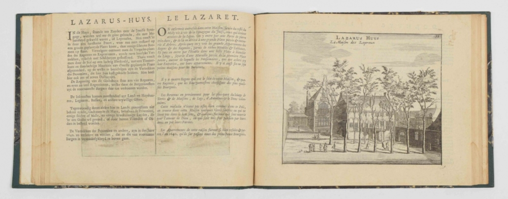 D'Amsterdam et deses [de ses] principaux bastimens. N.pl., n.publ., n.d., with 71 engravings numbered 1-71 (incl. title w. coat of arms (1) and plan (2)), several signed I. Veenhuysen (or. I.V.) or S. Webbers in the plate, all w. letterpress Dutch and French text in columns on verso, w. description of the facing illustration, both illustrations of the town hall w. 16 extra letterpress p. (quires B and C), w. 3 letterpress index p. at the end (starting verso of illustration 71), 19th-cent. half cloth, oblong 4to (in 8vo size: 15 x 20 cm).