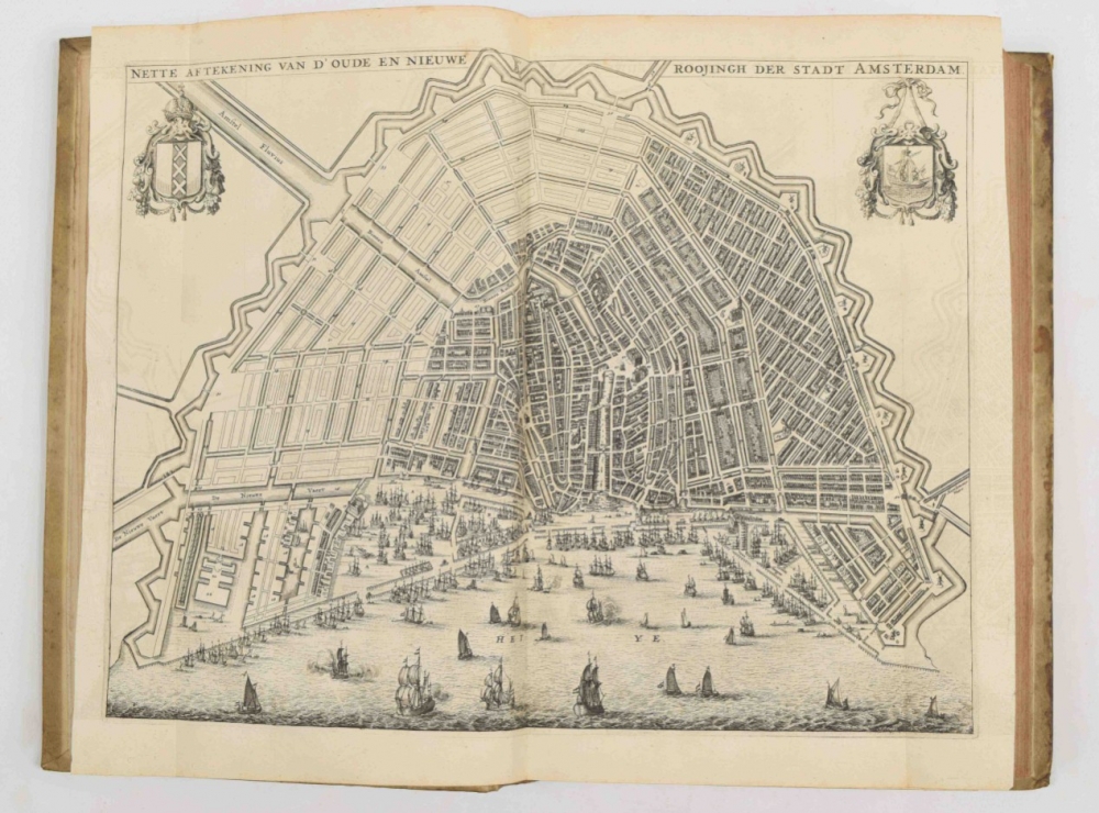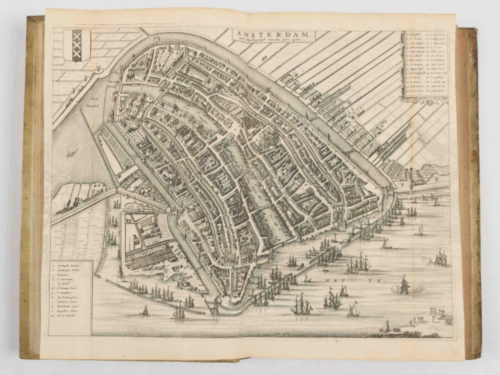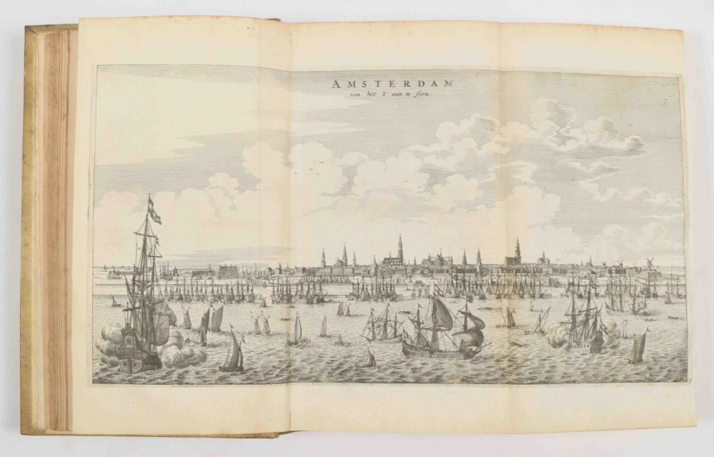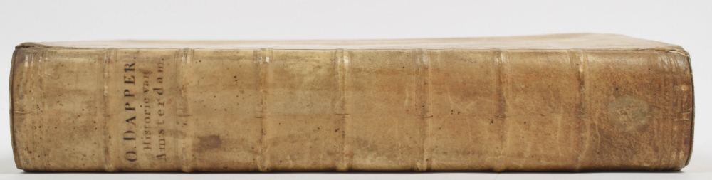 waer in de voornaemste geschiedenissen (na een kort verhael van gansch Hollant en d'omleggende dorpen, als ambachts-heerlijkheden, onder deze stadt gelegen) (...) hier ter stede voor-gevallen zijn, verhandelt, en al de stads gemeene, zoo geestelijke als wereltlijke, gebouwen, in meer als tzeventigh kopere platen, met haer nevenstaende beschrijving, vertoont worden. Door dr. O. D. [Olfert Dapper]. Amsterdam, J. van Meurs, 1663, (12),552,(84) p., with engr. frontispiece and 72 double-p./ fold. maps, views and plates (incl. the fine profile), 1 text illustration, contemp. blindst. vellum, ribbed spine w. old manuscript title, folio.
