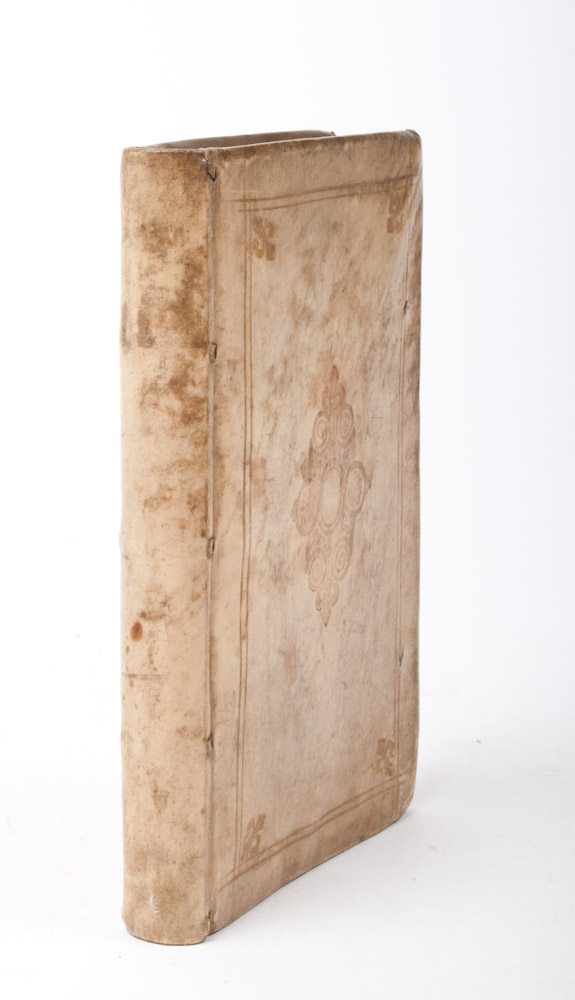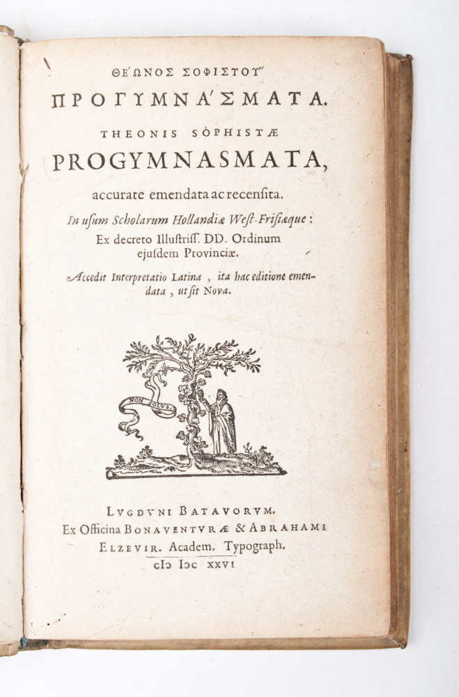Sm. 8vo., vellum, blindtooling on gilt-stamped sides, 2 title pages with different printer's vignette, (14),144,(6),102 pp., ex-libris, rubbed endpaper, name owner in hw on endpaper, binding shoddy, sticker on spine, worming, foxed internally, but good; 2 parts in one vol. Exercises in sophist rhetoric. Greek text next to Latin translation.