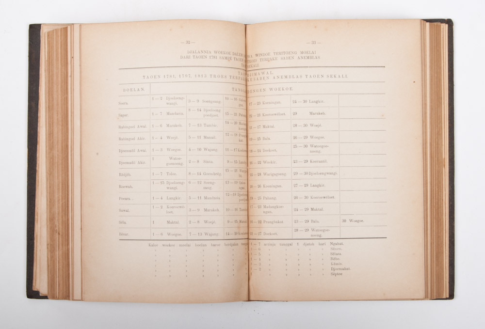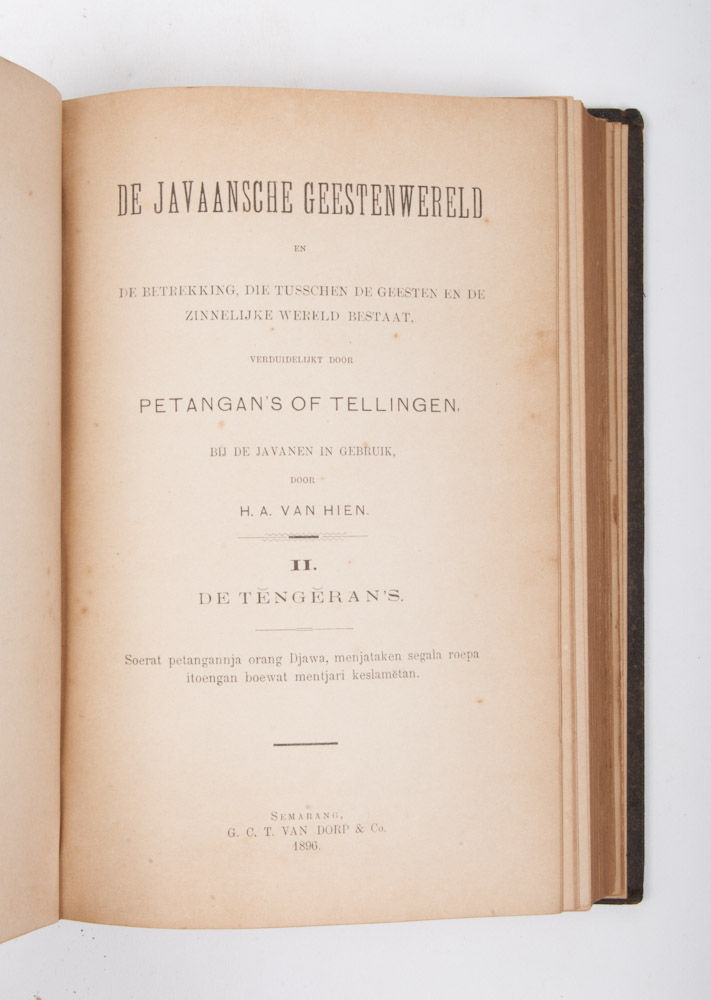 Bookblock loosening, paper edges somewhat brittle. Good copy of the rare first edition (in 1884 Van Hien already published the work "De Petangan's of tellingen der Javanen"). Important and classic work in the field of Javanese mysticism and spirit world, witchcraft and astrology, reprinted many times. I. De Primbon's; II. De Tengerann's; III. De Woekoe's; IV. De Ngelmoe's.