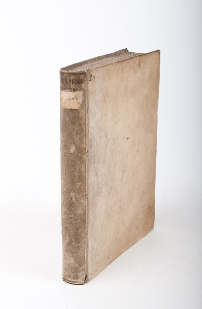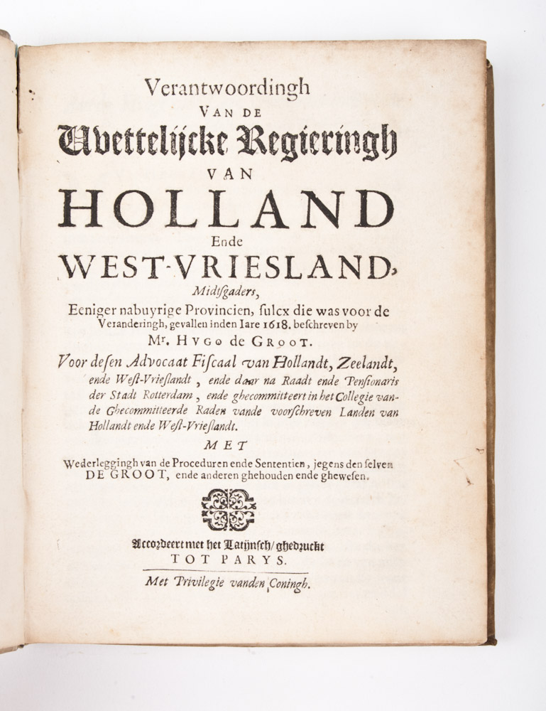 Sm. 4to., title in hw on spine, vellum, title, 16,287 pp., First edition. De Groot's famous apology, for the government of Holland before the revolution of 1618, as well as for his own behaviour. Reprinted various times in 1623, translated from Latin by De Groot himself. Sticker on spine, binding shows signs of use and various waterstains, esp. in the back, apart from that a good copy.