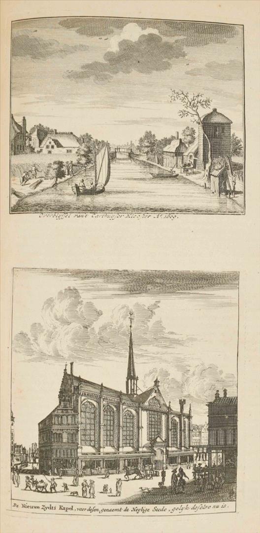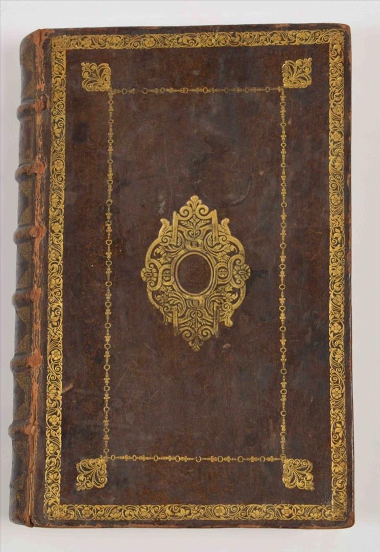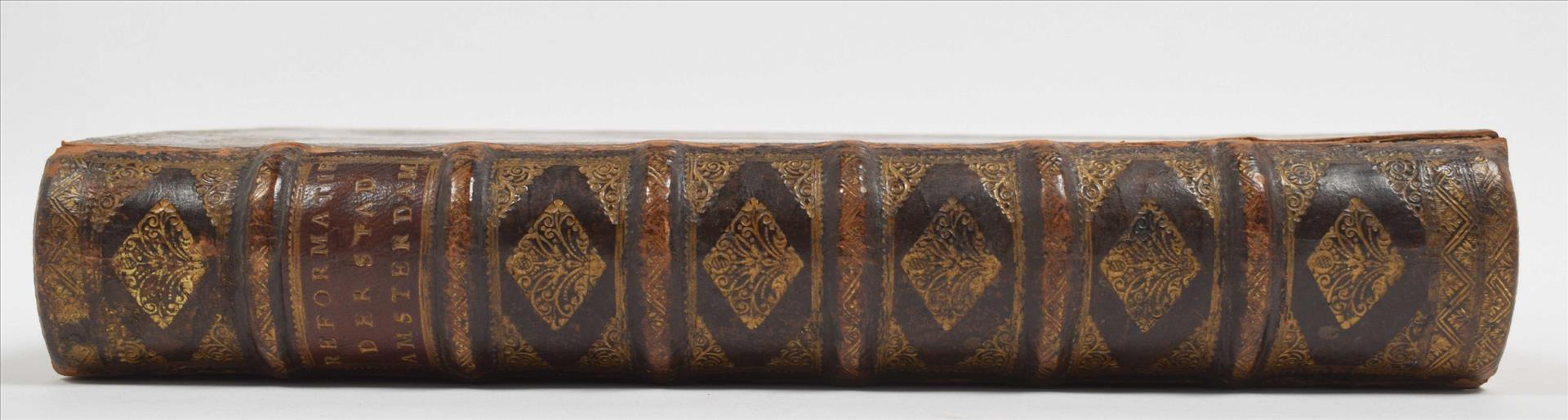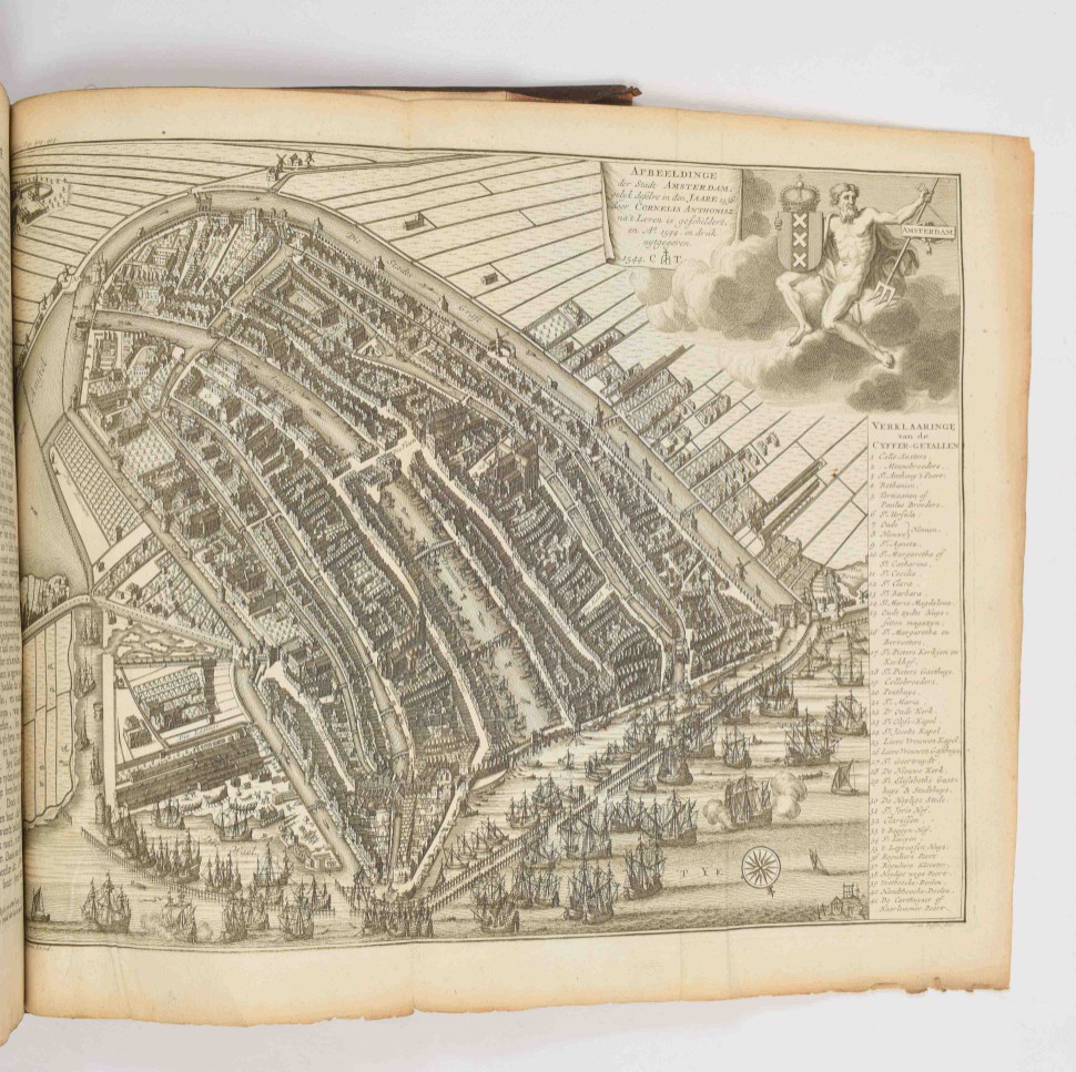 door Isaak le Long. Amsterdam, J. van Septeren, 1729, (8),576,(11) p., with the following engravings (per binder's index): large fold. view of the Boterkerk ("Coupel-Kerk met Booter-markt", 51.5 x 70 cm), double-p. plan of Amsterdam, double-p. almanac, 50 illustrations on 23 plates and 17 illustrations in the text, contemporary richly gilt calf, ribbed spine w. mor. letterpiece, folio.