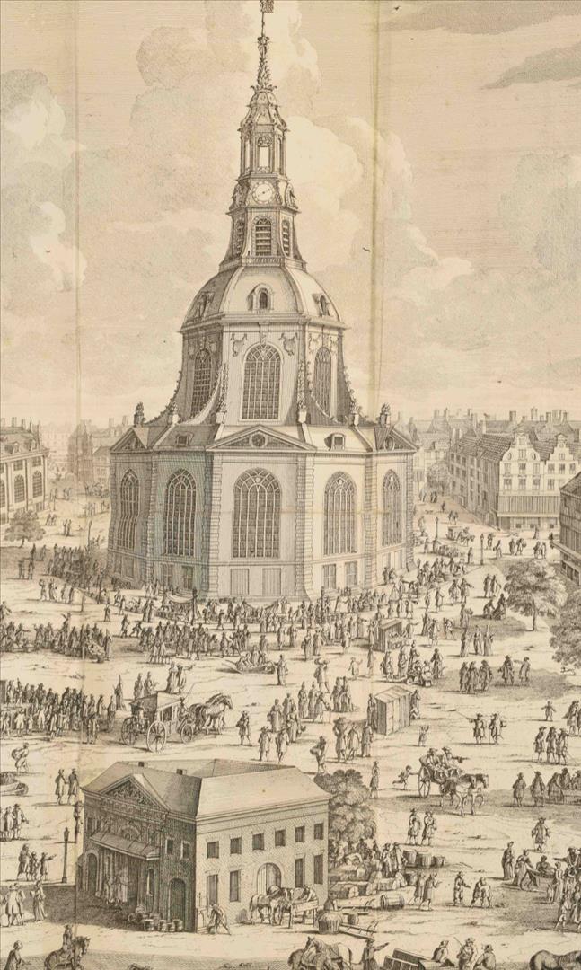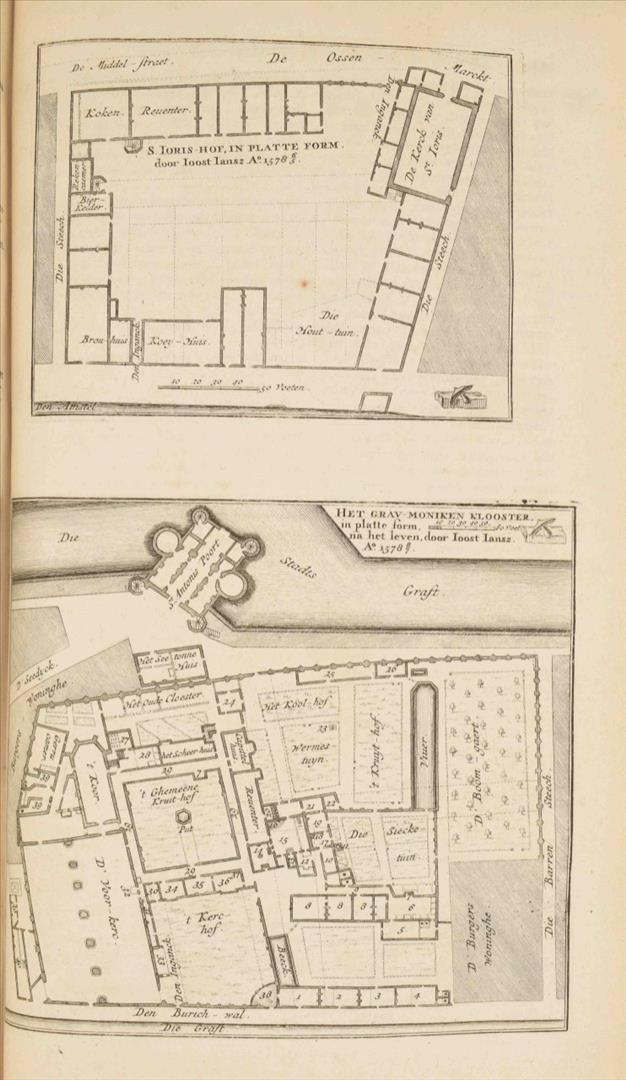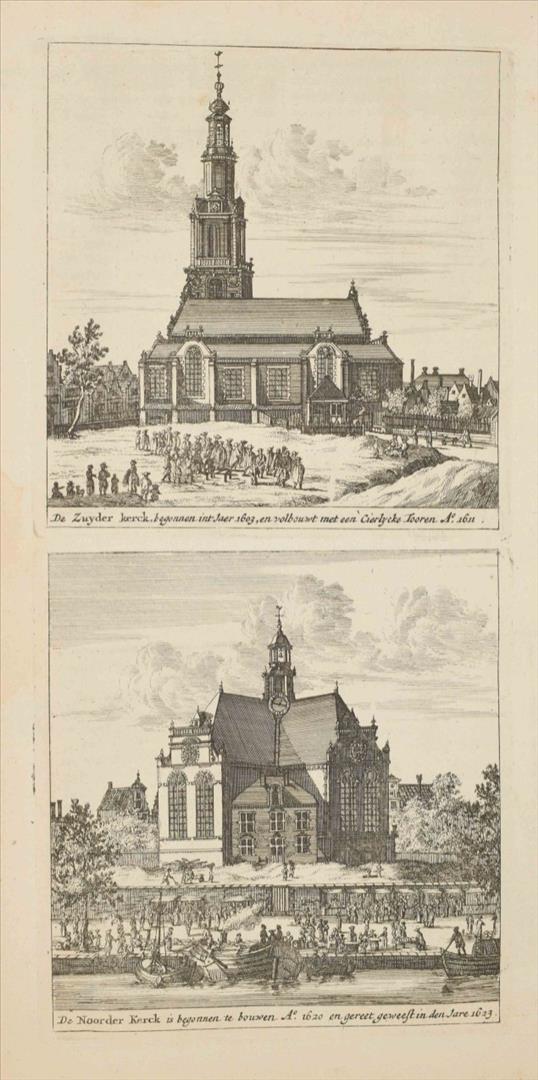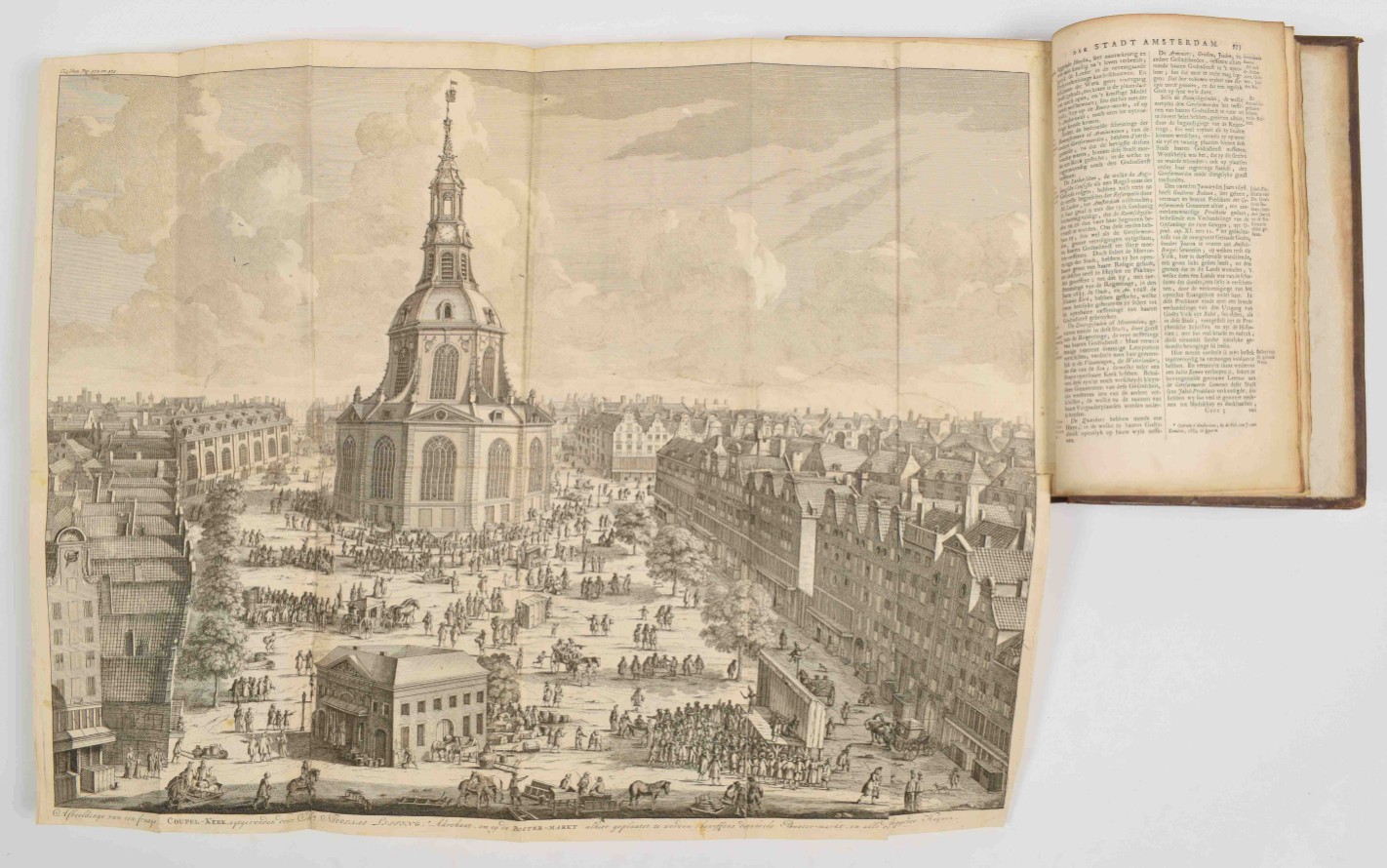 door Isaak le Long. Amsterdam, J. van Septeren, 1729, (8),576,(11) p., with the following engravings (per binder's index): large fold. view of the Boterkerk ("Coupel-Kerk met Booter-markt", 51.5 x 70 cm), double-p. plan of Amsterdam, double-p. almanac, 50 illustrations on 23 plates and 17 illustrations in the text, contemporary richly gilt calf, ribbed spine w. mor. letterpiece, folio.