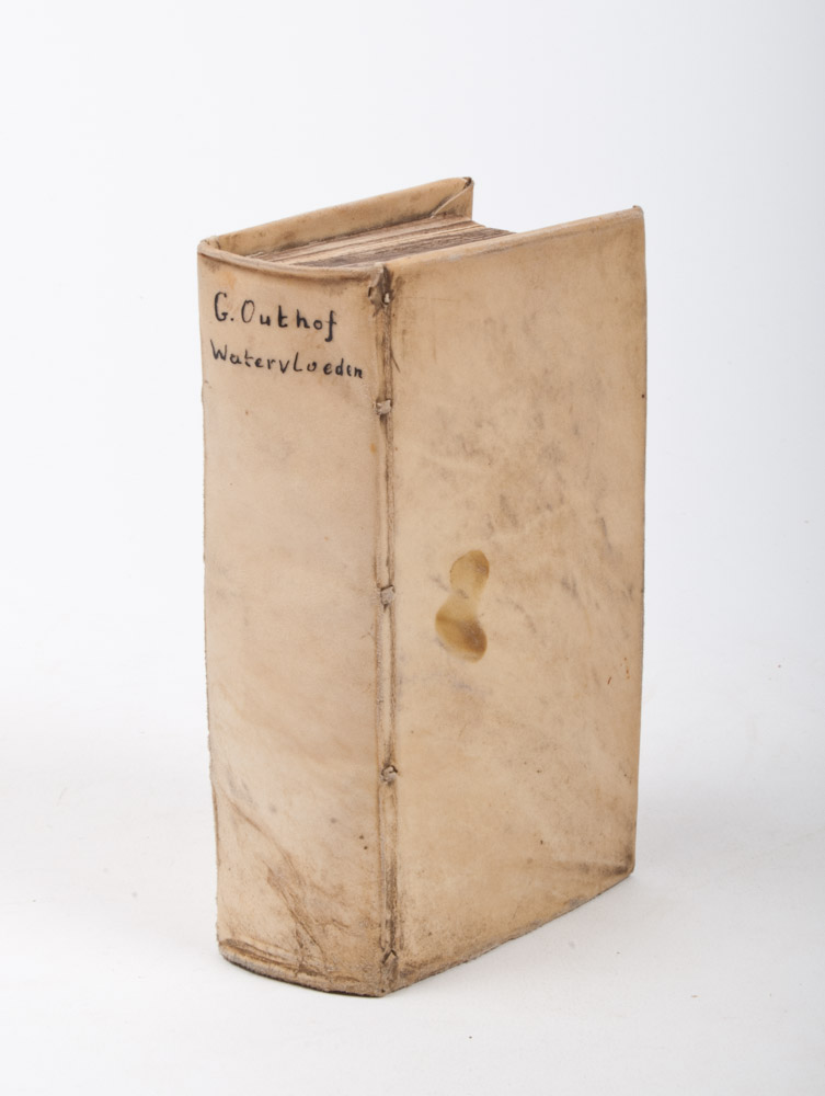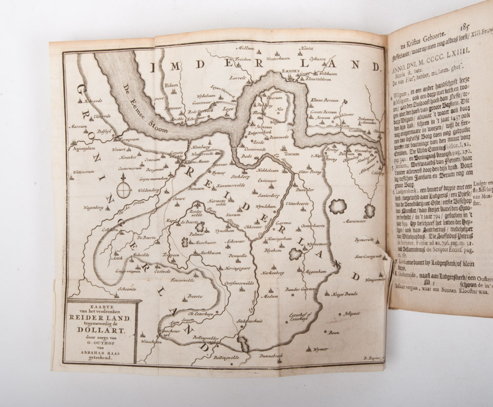 Sm. 8vo., vellum, title in hw. on spine, title in red and black, (42),504,52,104 pp., with a map (folded) of the submerged Reiderland, now the Dollart, by Abraham Maas, binding stained, internally good. First edition.