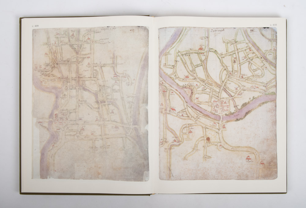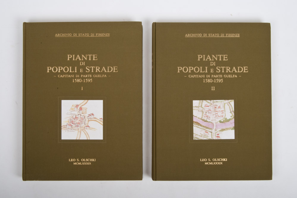Archivio di Stato de Firenze, Piante di Popoli e Strade, I. (and) II. Capitani di Parte Guelfa 1580-1595. Introduction: Giuseppe Pansini, the cartographic vol. by Leonardo Rombai and the indices by Lodovico Branca and Matteo Barbarulo. Published by Leo S. Olschki, Florence, 1989. Reproductions in colour of original cartographic material kept in the State Archive in Florence. 2 vols., folio, cloth with title on spine and gilt-stamped front cover, cartographic images on front cover vol. I and vol. II. Plastic protective flaps, 652 p. with 574 colour reproductions. In very good condition. (total 2)