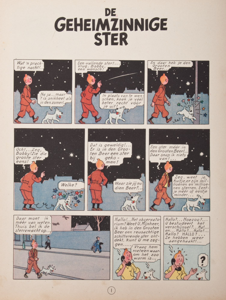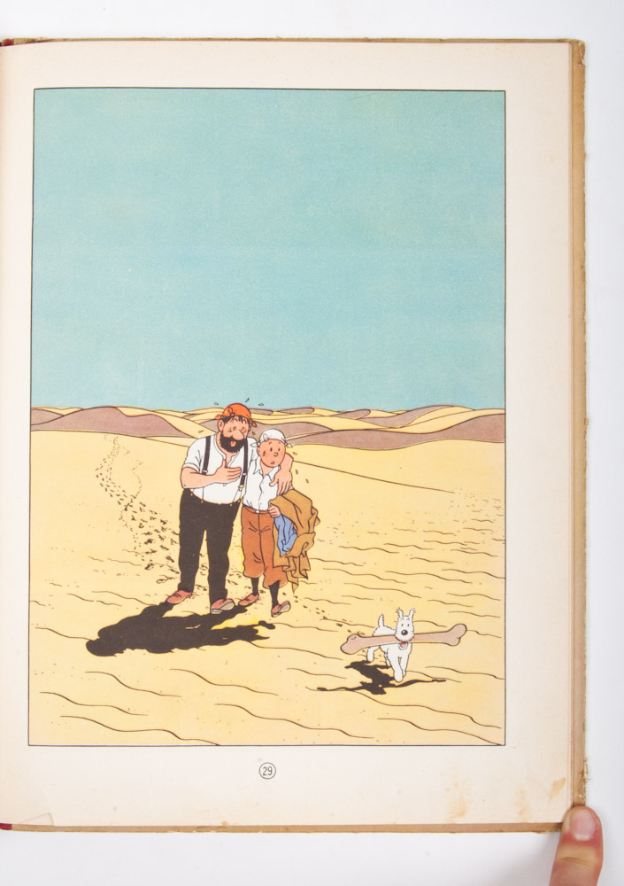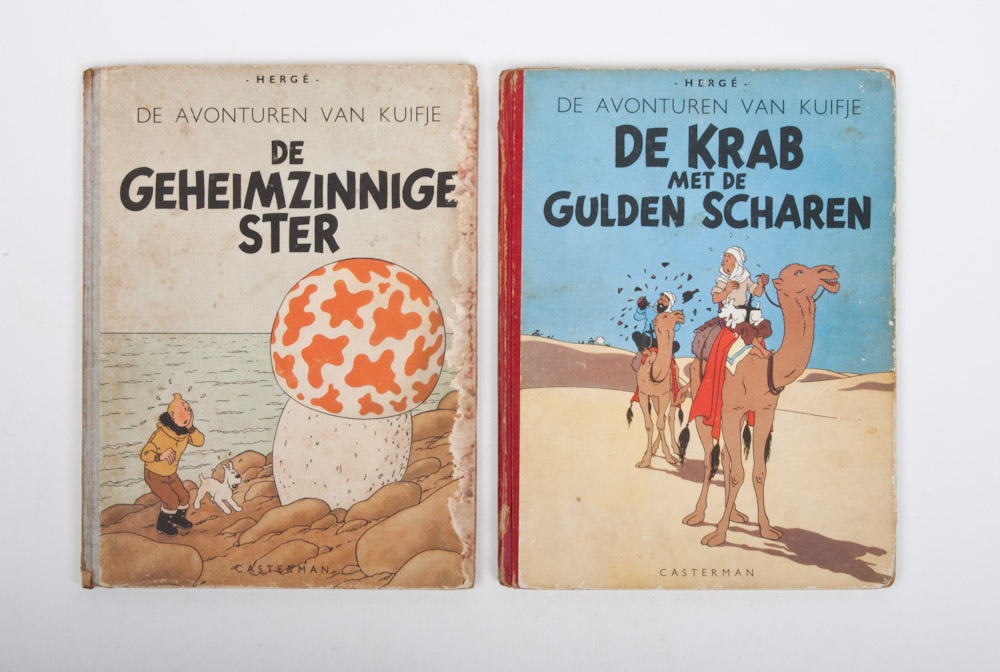 De Krab met de Guden Scharen. Casterdam, later edition, 1952. Copy in fairly good condition. Scratched along spine and edges, name (small) on endpaper + De Geheimzinnige Ster, Casterman, 1947. 1st edition in poor condition with dampst. on right side front and back covers.