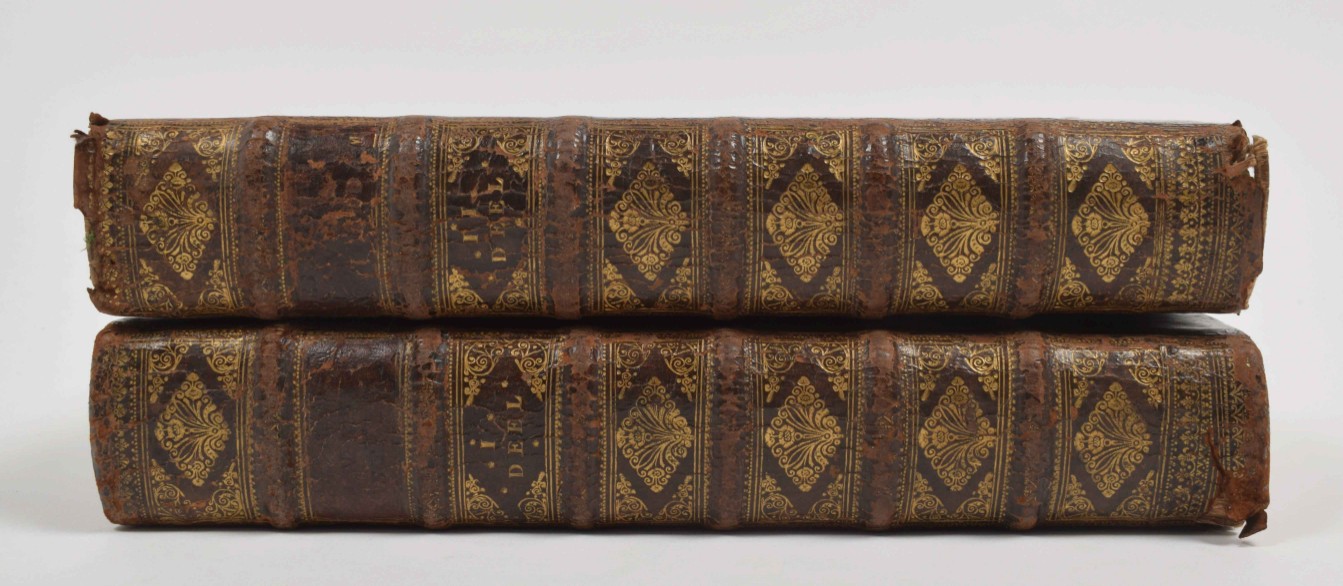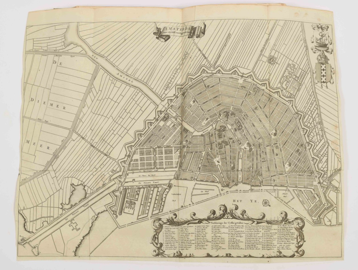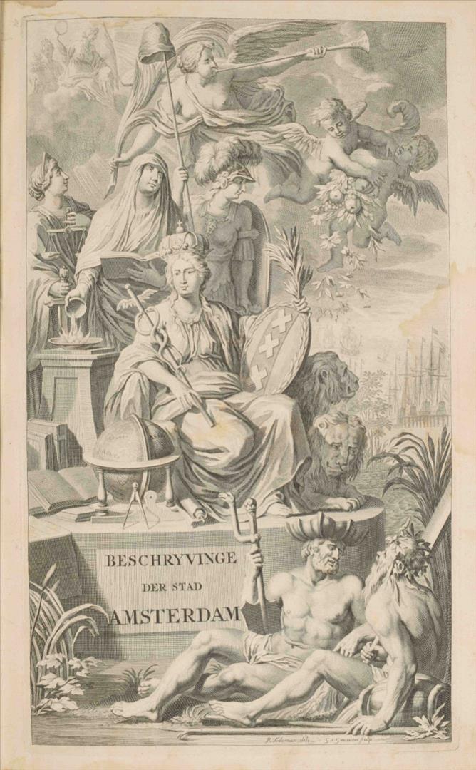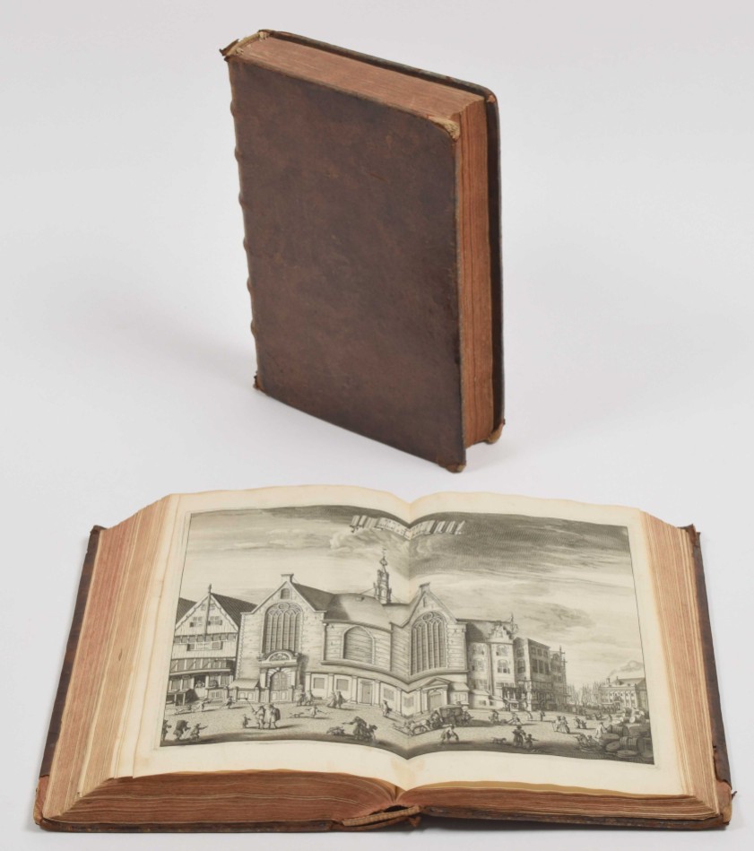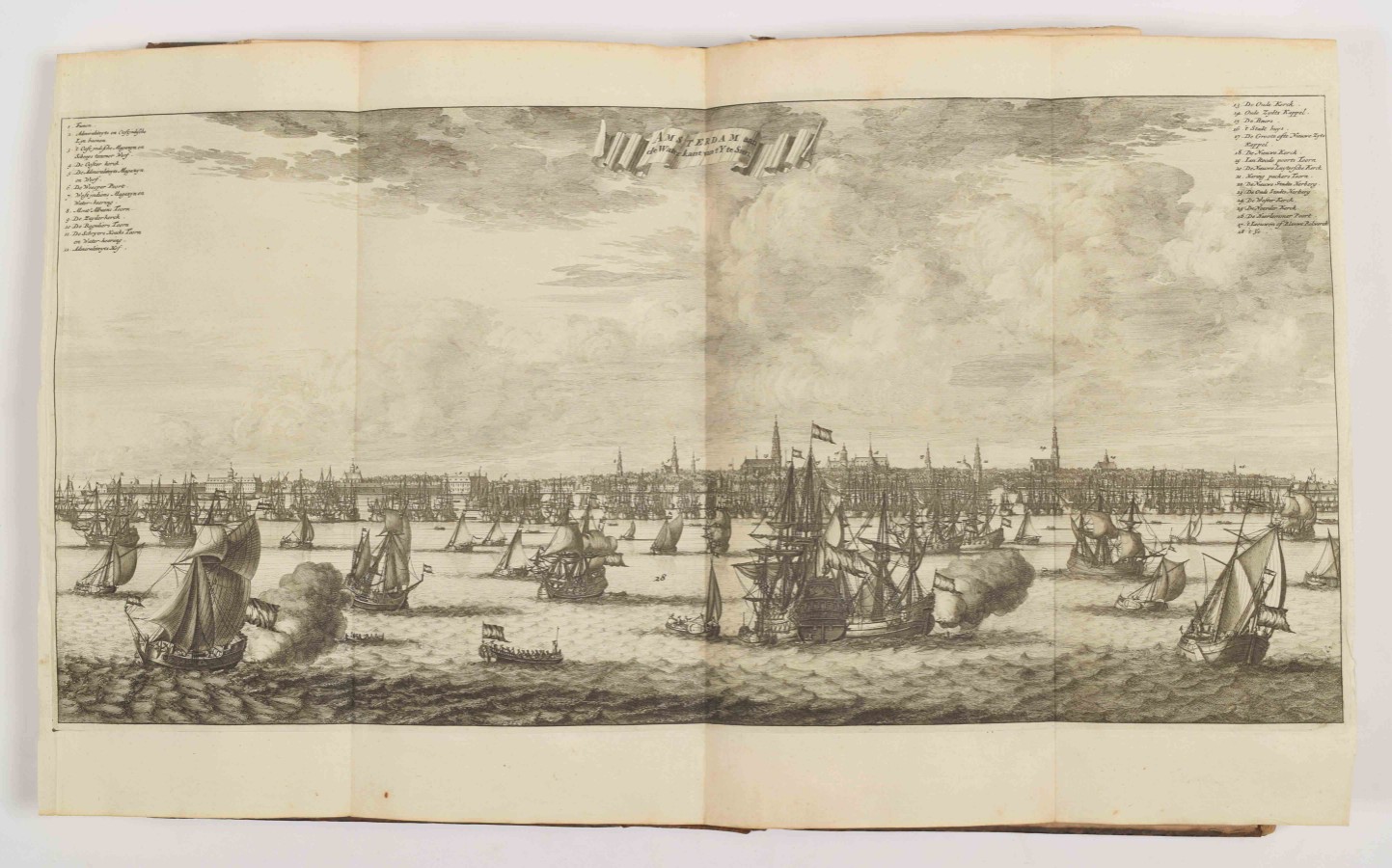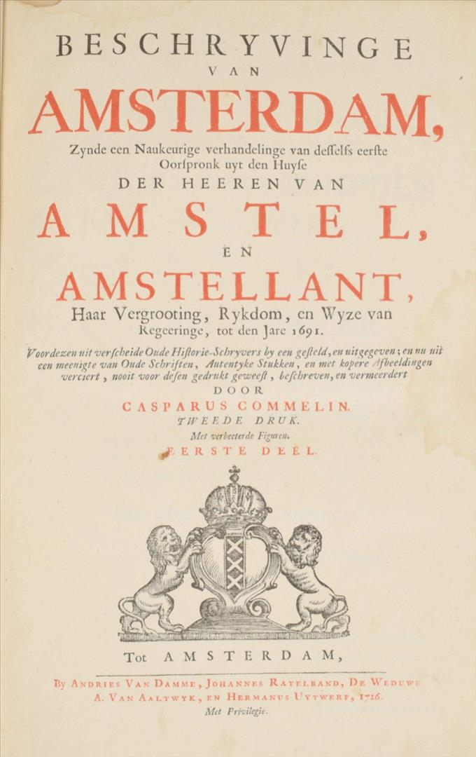 zynde een naukeurige verhandelinge van desselfs eerste oorspronk uyt den huyse der Heeren van Amstel en Amstellant, haar vergrooting, rykdom, en wyze van regeeringe, tot den jare 1691 (...). Door Casparus Commelin. Tweede druk. Met verbeterde figuren. Amsterdam, printed by W. and D. Goeree for A. van Damme etc., 1726, 2 vols., (20),600; (2),1223,(41) p., with the following engravings: frontispiece, 1 fold. panorama, 5 (fold./ double-p.) maps, 46 (double-p.) views and plates, numerous illustrations in the text (several woodcuts), 3 double-p. letterpress plates, contemp. unif. calf w. gilt and ribbed spine, folio.