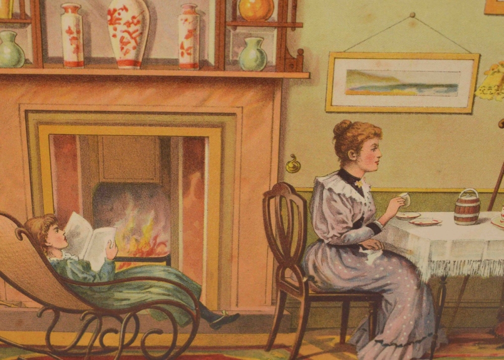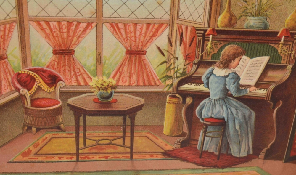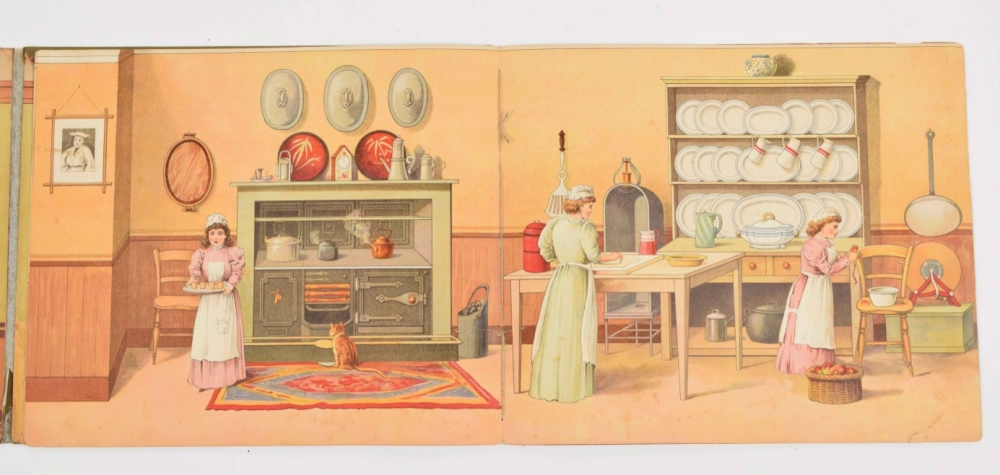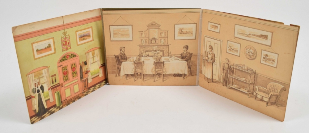 Kluitman, 1895. Cardboard picturebook which can be set up as a triangular dollhouse, with 3 colour illustrated boards and a triangular roof. Pages alternating coloured and black lithographs. Dining room, living room and servants' area. Fine copy.