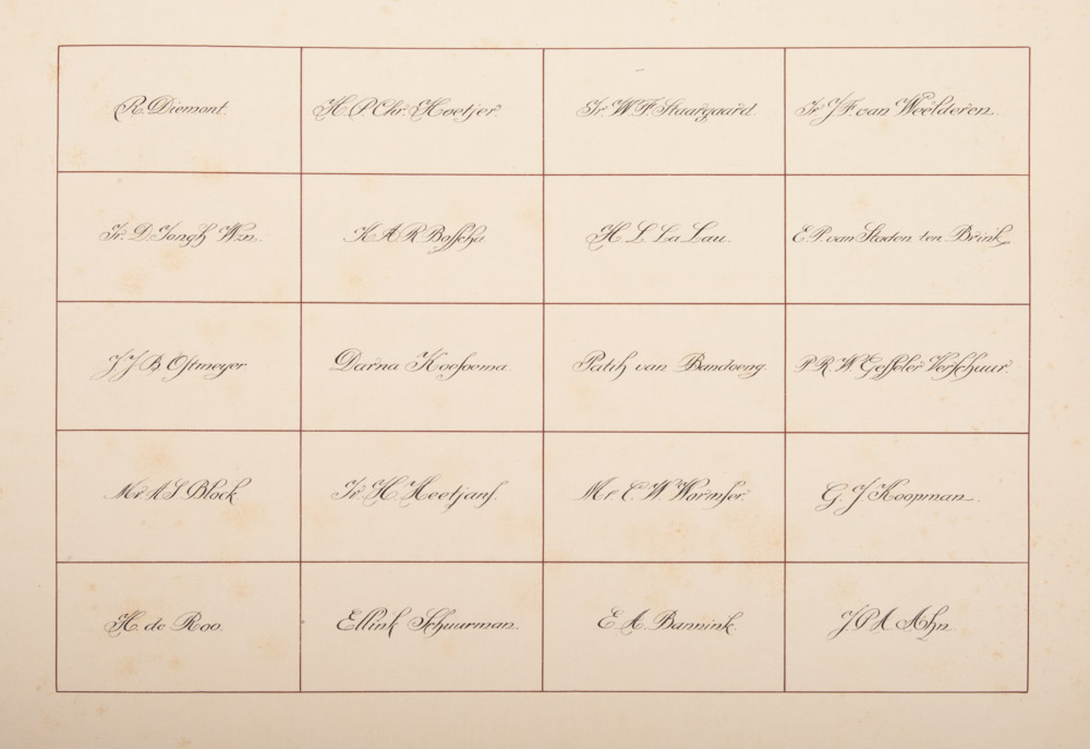 Album aangeboden door de deelnemers in het huldeblijk aan B. Coops, Burgemeester van Bandoeng ter gelegenheid van zijn vertrek naar Europa, 11 juli 1928. Folio (35.5 x 50 cm) album with hand-drawn coat of arms on front cover. Hand-painted title page Dirk Rühl Jr., mixed technique. Inside 434 names.