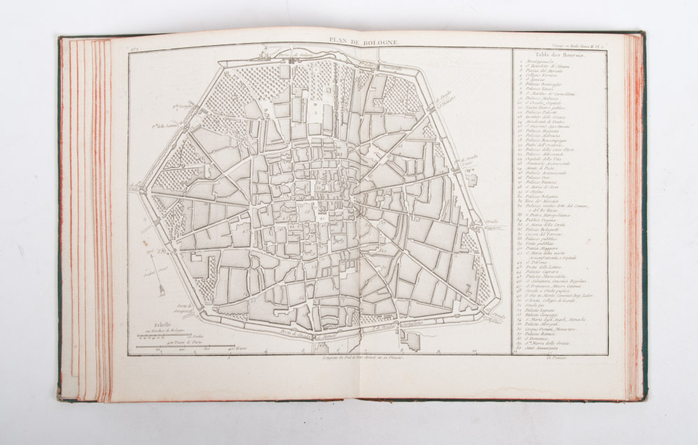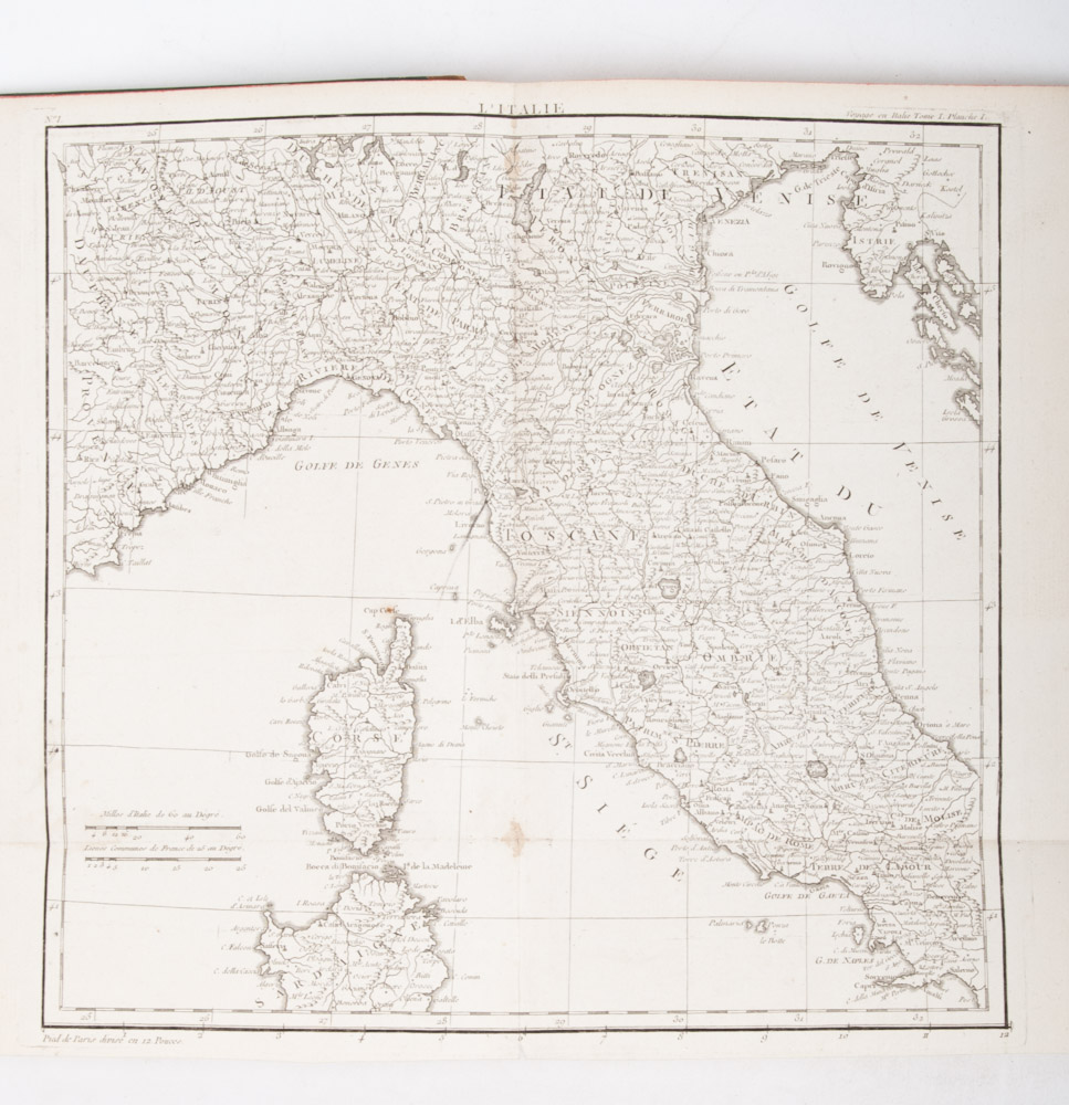 [by Joseph Jérôme Le François De La Lande. Atlas, (Paris, widow Desaint, 1769), with folding engraved map of Italy and 1 other double-paged map, 12 double-paged engraved city plans and 1 smaller city plan, 5 engraved views (1x double-paged) and 2 plans of buildings, contemporary gilt half leather, 4to.